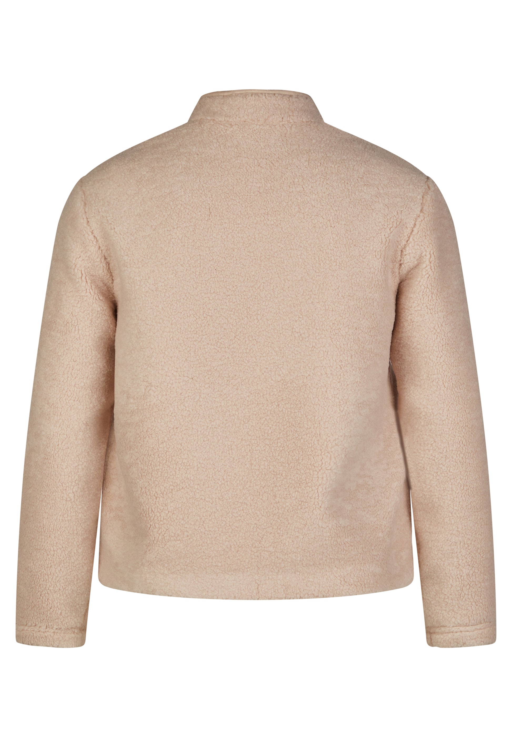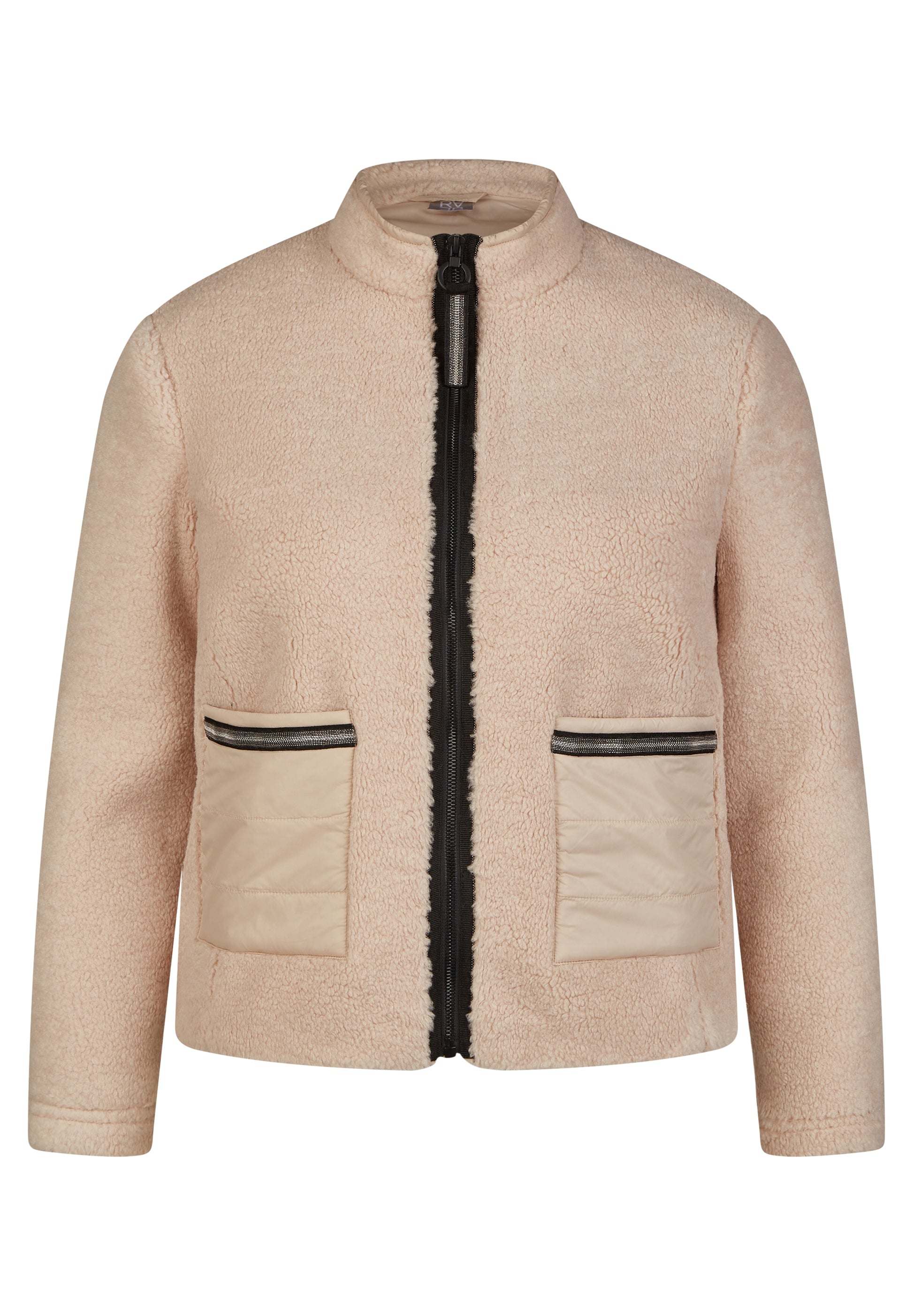 Rabe Jacke 53-221220. Dieses gerade geschnittene Modell hat einen Stehkragen und lange Ärmel. Diese beige Jacke von Rabe wird mit einem Reißverschluss geschlossen und ist aus Teddy-Qualität gefertigt. Dieses Modell hat zwei Seitentaschen mit metallischer Paspelierung.