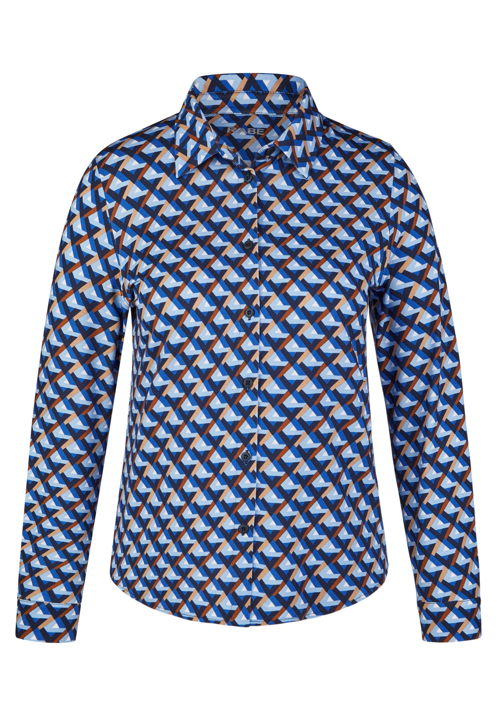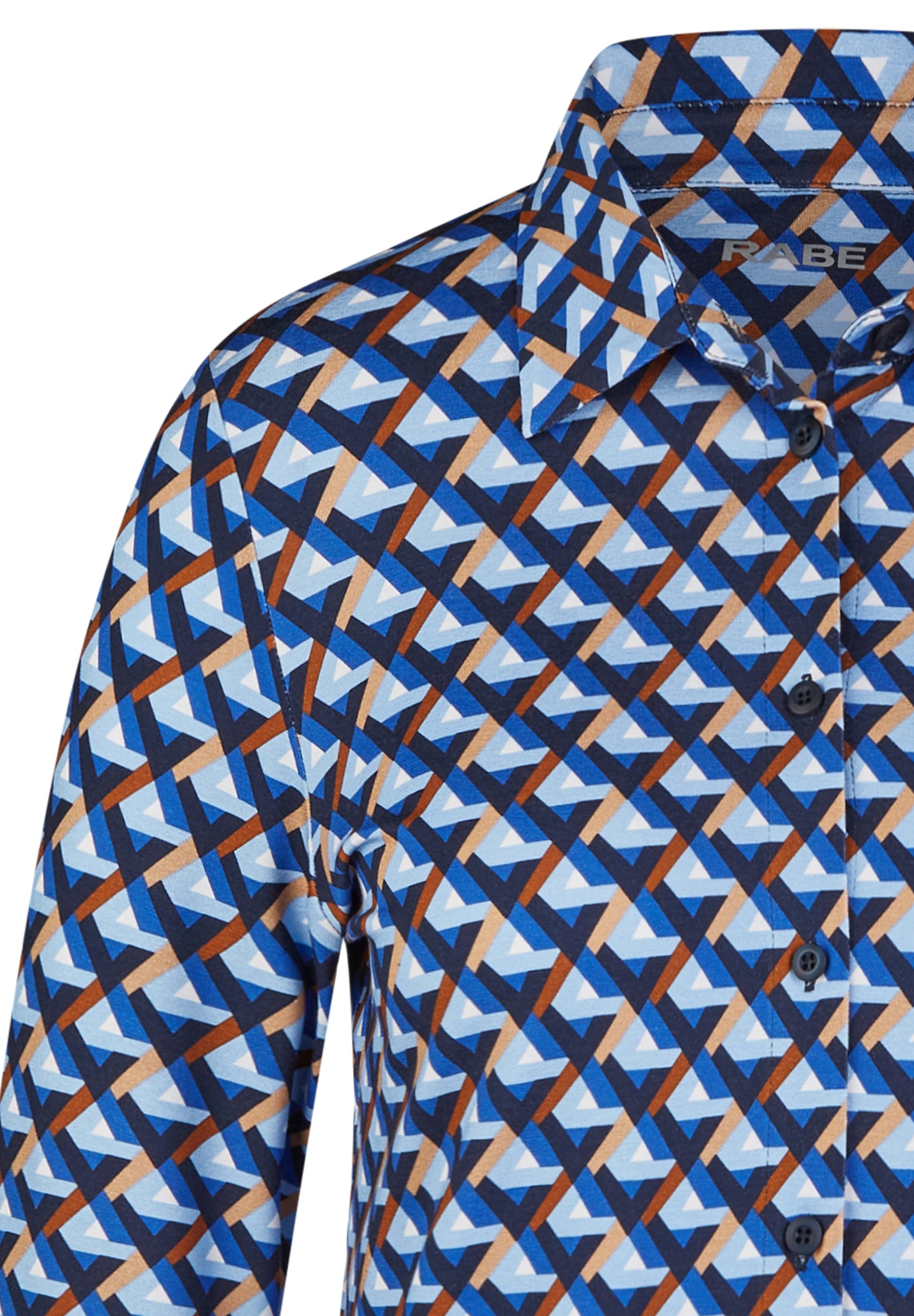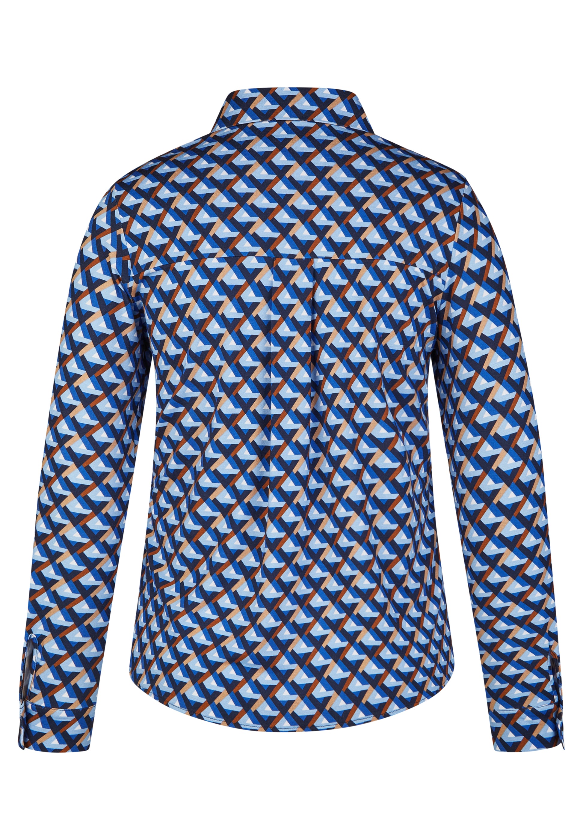 Das auffällige Muster in Blau-, Weiß- und Brauntönen verleiht dem Shirt einen modischen Look. Der Hemdkragen und die Knopfleiste sorgen für den eleganten Blusen-Look, während der weiche Stoff für ein angenehmes Tragegefühl sorgt. Perfekt für den Alltag oder im Büro _ stilvoll und bequem zugleich!