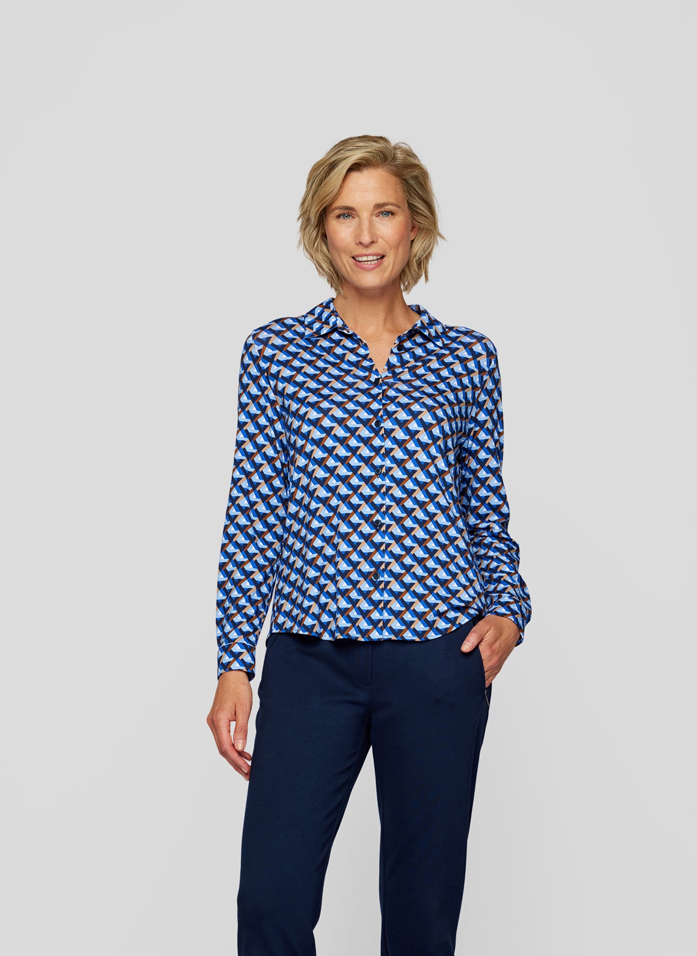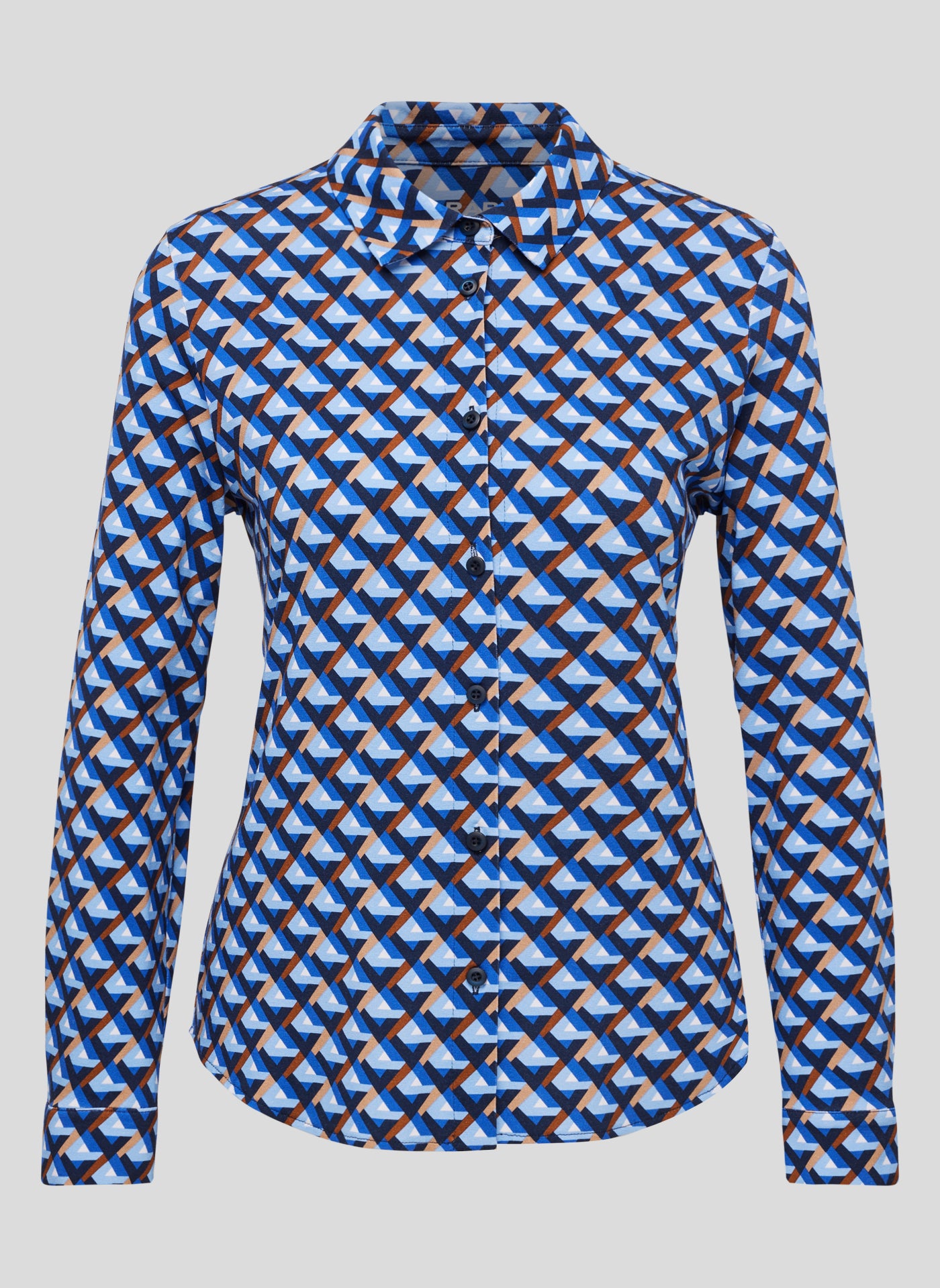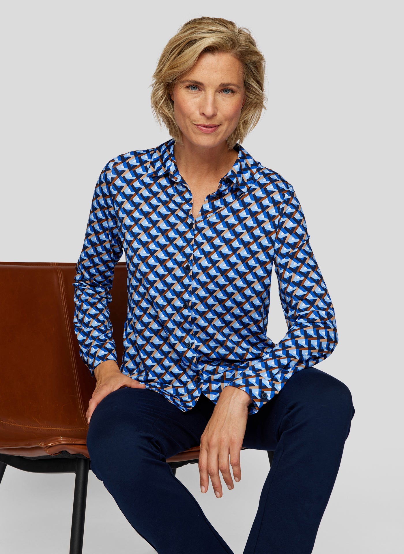 Das auffällige Muster in Blau-, Weiß- und Brauntönen verleiht dem Shirt einen modischen Look. Der Hemdkragen und die Knopfleiste sorgen für den eleganten Blusen-Look, während der weiche Stoff für ein angenehmes Tragegefühl sorgt. Perfekt für den Alltag oder im Büro _ stilvoll und bequem zugleich!
