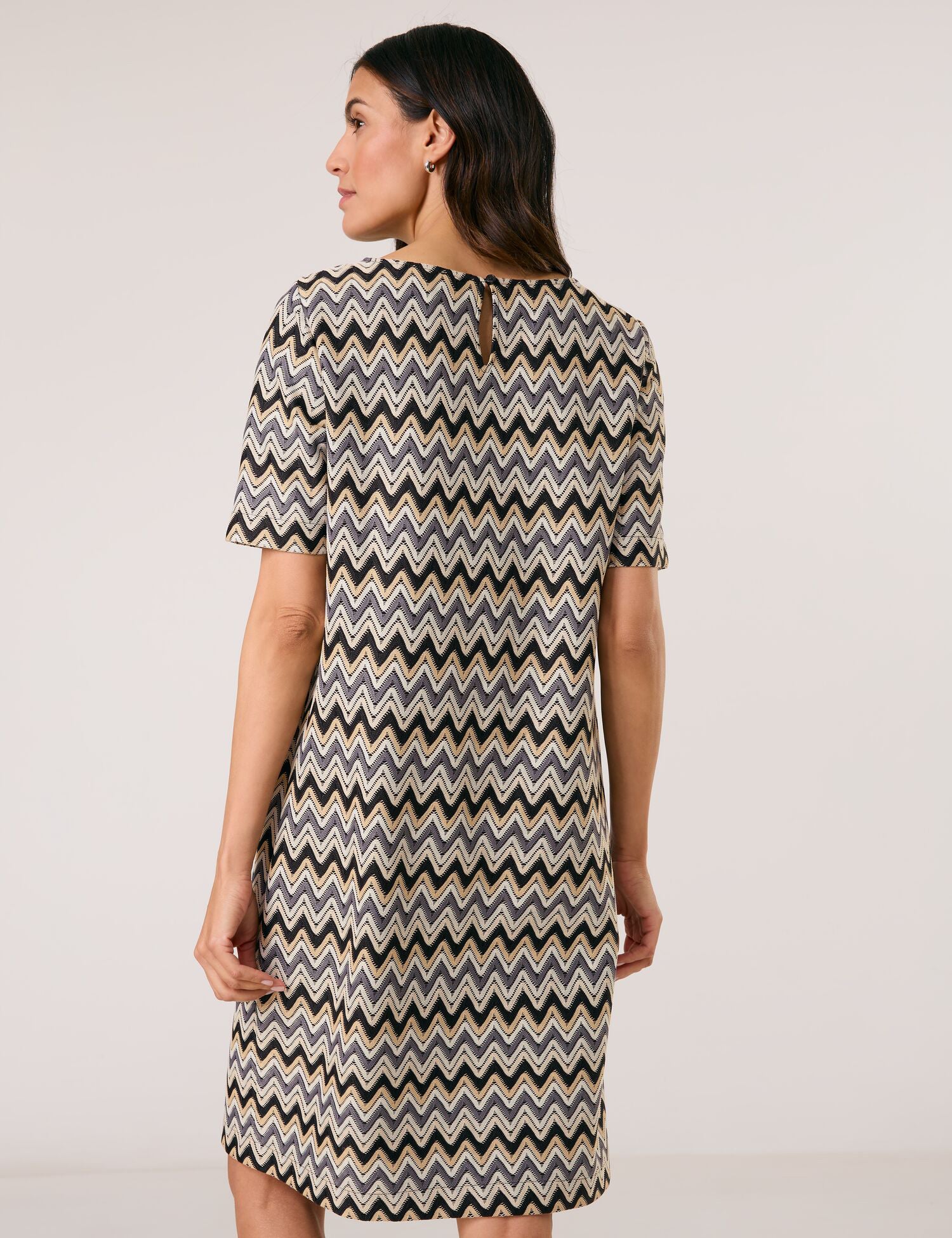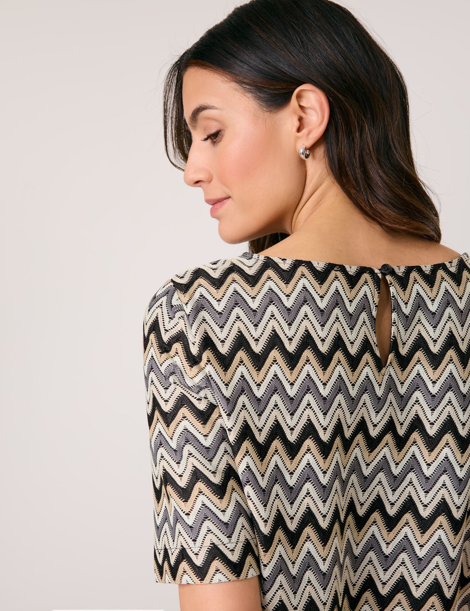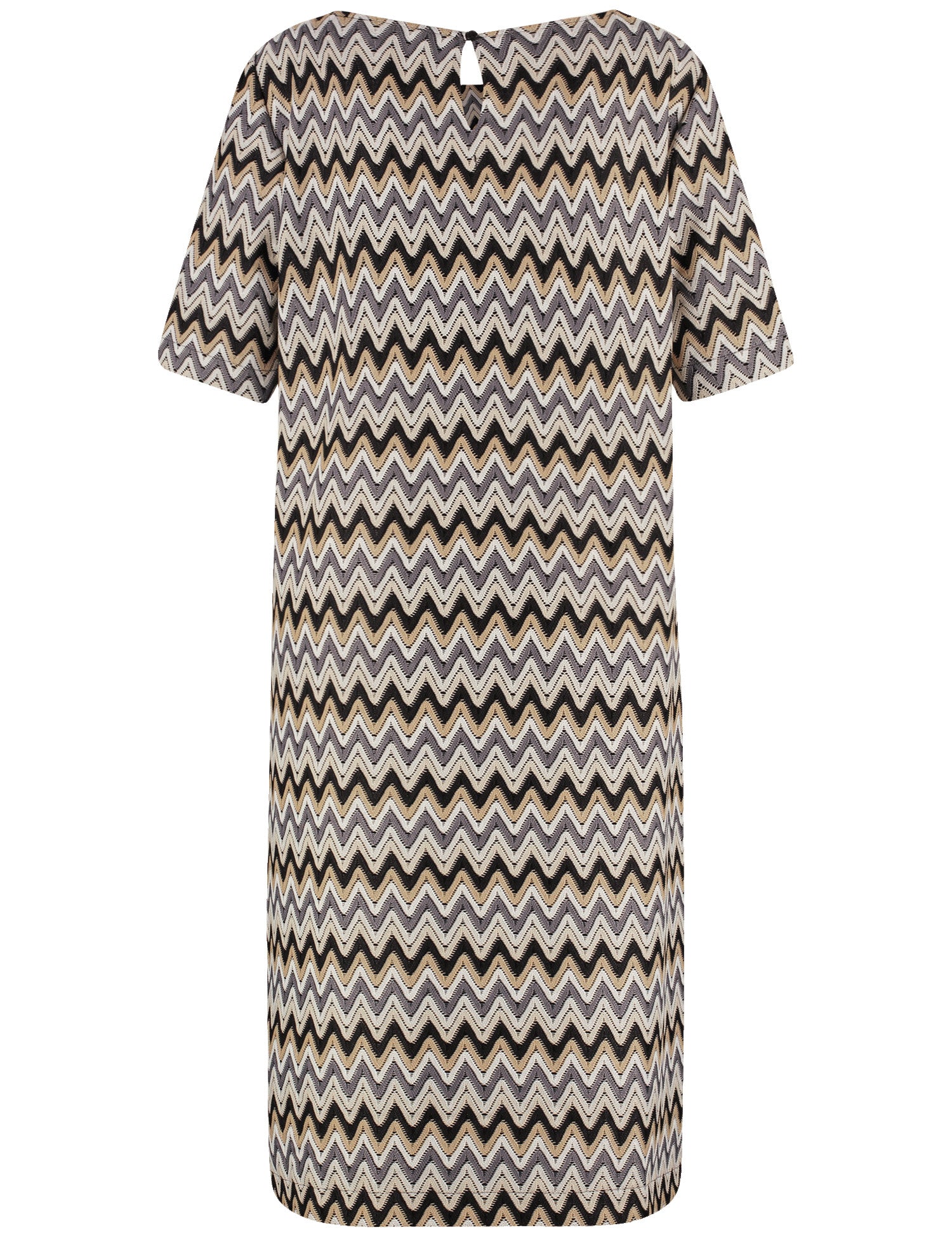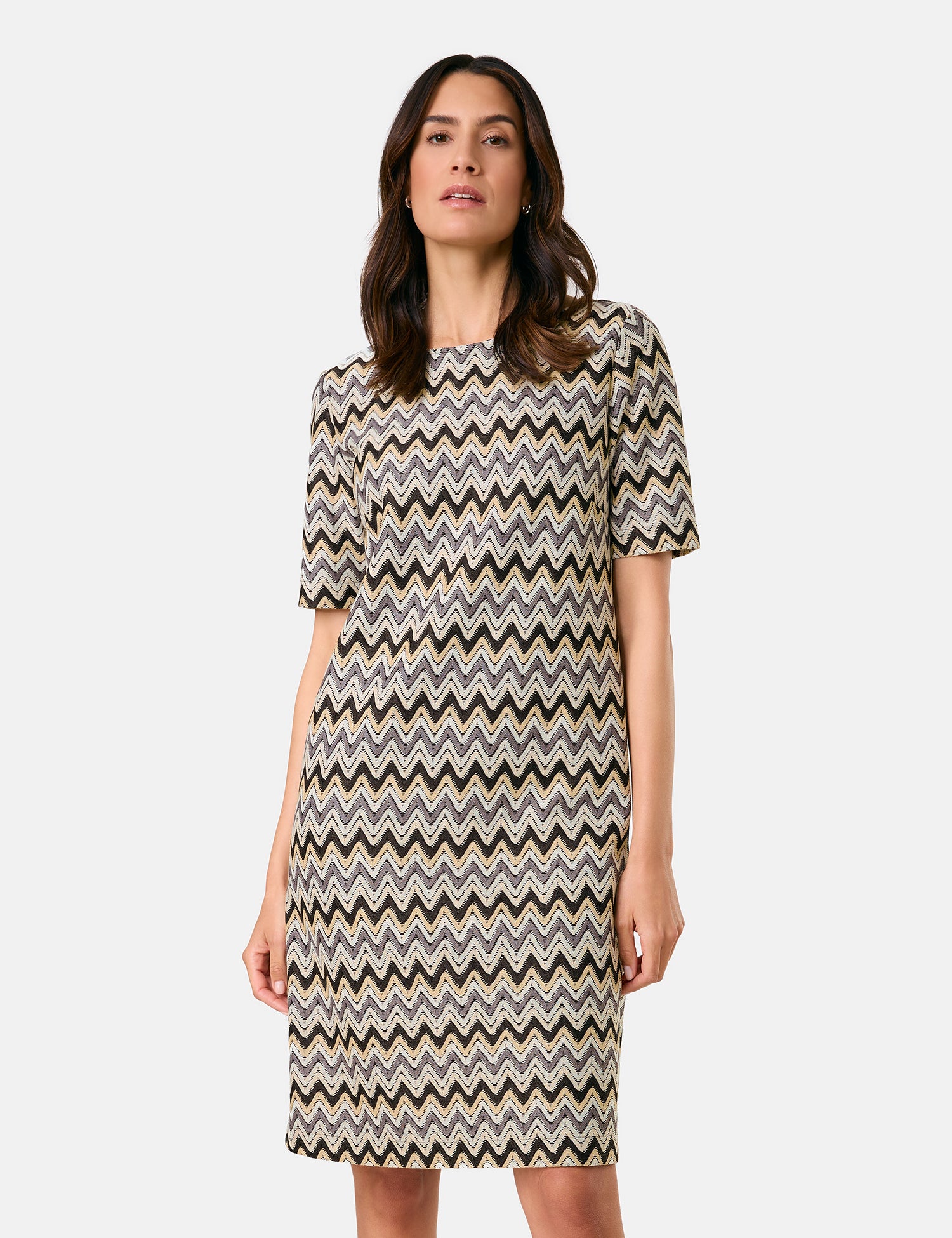 Paspelierter Ausschnitt. Brustabnäher. Dieses figurumspielende Etuikleid vereint Eleganz und Modebewusstsein. Das Zickzack-Muster in Häkeloptik verleiht ihm eine besondere Struktur, während der kleine Schlitz mit Knopfverschluss im Rücken einen raffinierten Akzent setzt. Angenehm zu tragen und vielseitig kombinierbar – perfekt für besondere Anlässe oder stilvolle Alltagslooks!