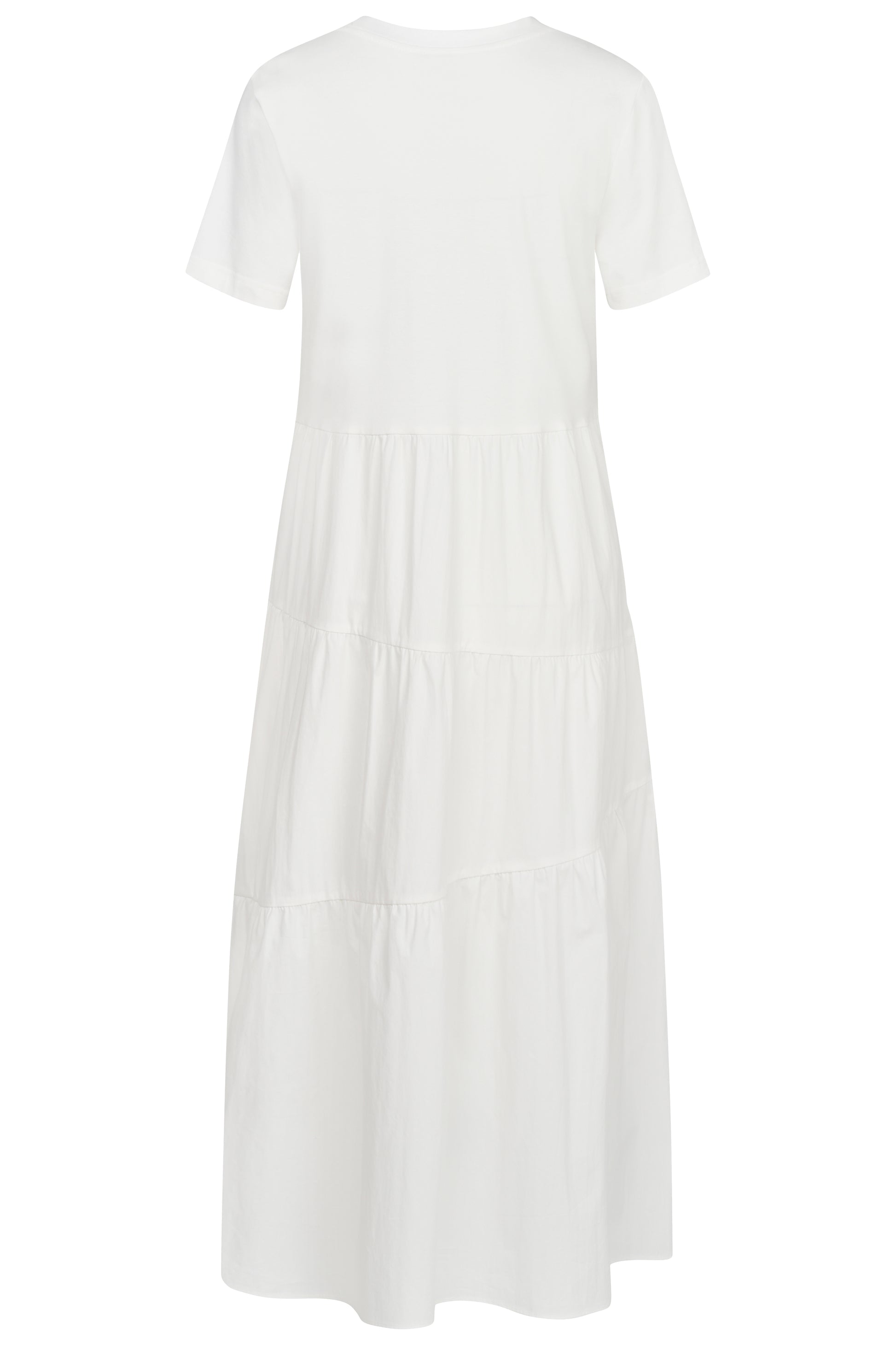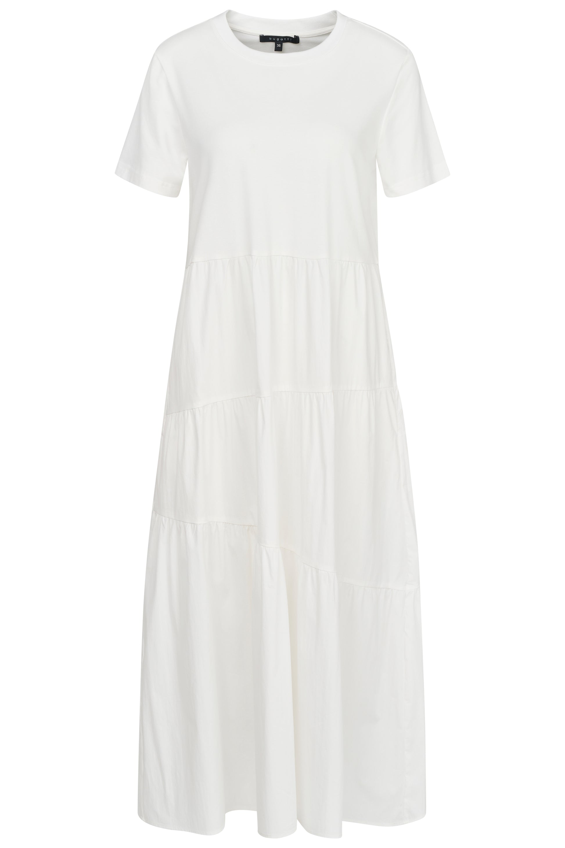 Kleid im Materialmix mit asymmetrischen Raffungen und Teilungsnähten.