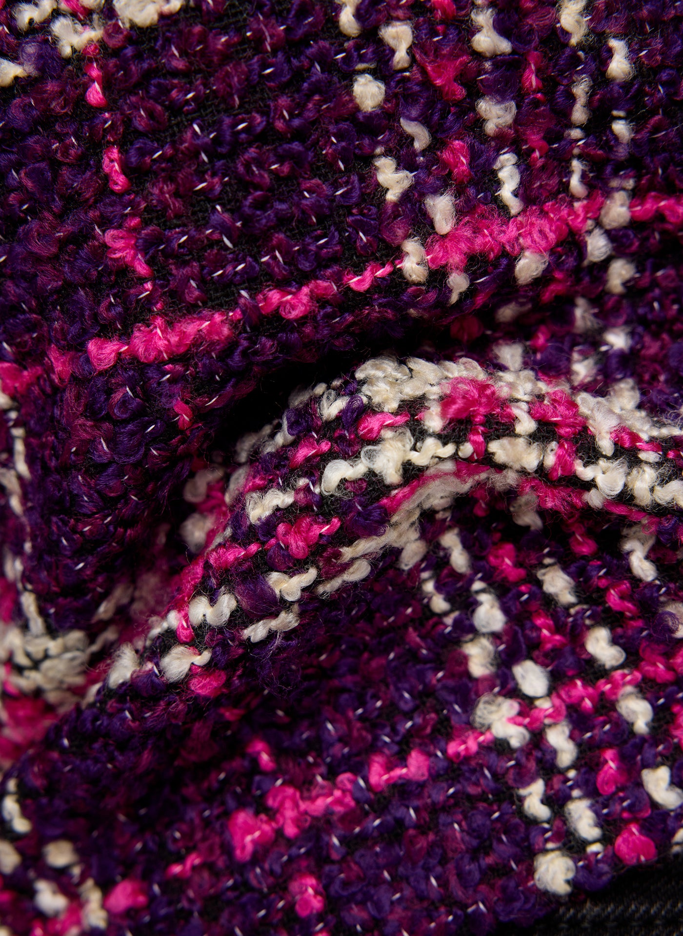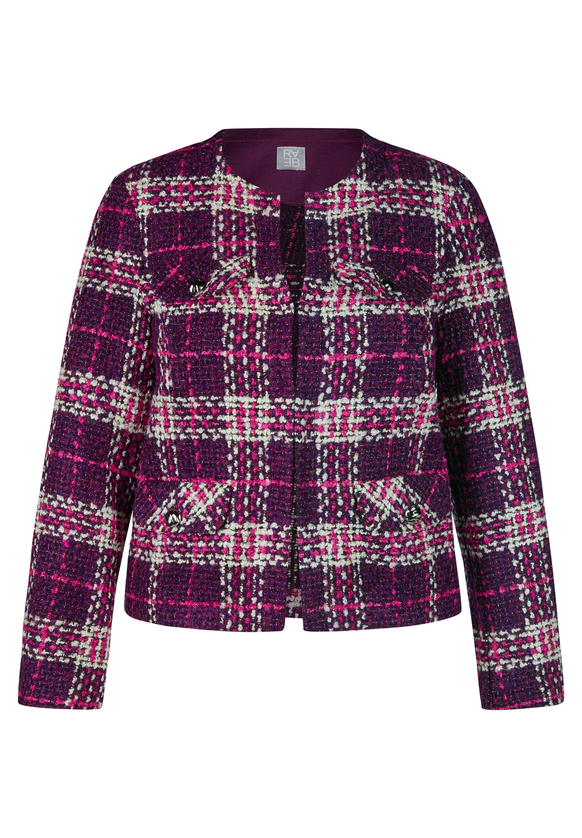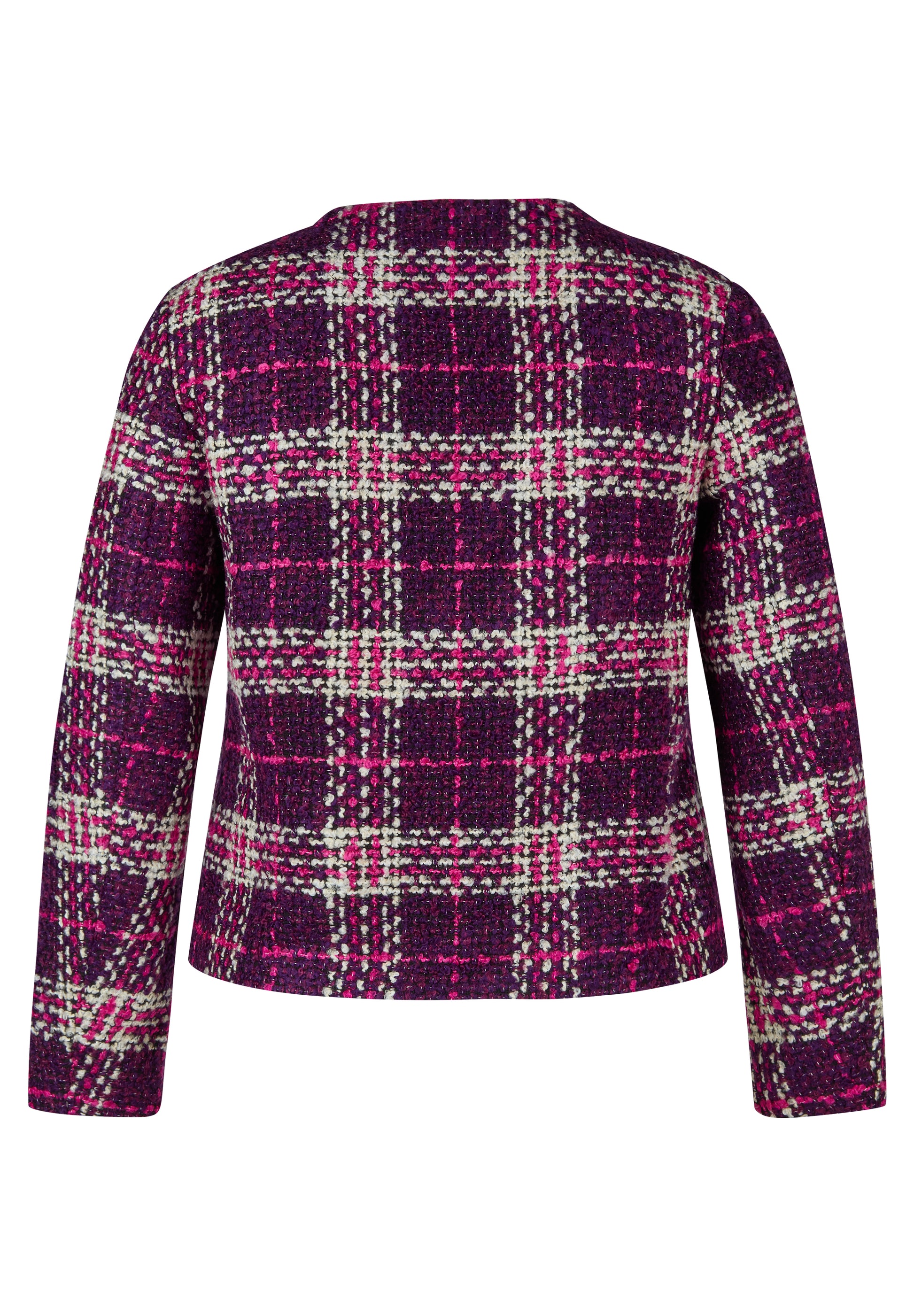Diese Bouclé-Jacke punktet mit einer strukturierten Oberfläche und einem markanten Karomuster in kontrastreichen Tönen. Der kastenförmige Schnitt verleiht dem Modell eine moderne Silhouette, während der kleine Hakenverschluss für eine cleane Front sorgt. Ideal kombinierbar mit Jeans oder schlichten Stoffhosen. Karomuster im modischen Bouclé-Look. Dezenter Hakenverschluss vorne. Kastenförmiger, offener Schnitt. Strukturierte Oberfläche mit Wollanteil. Angedeutete Brusttaschen.