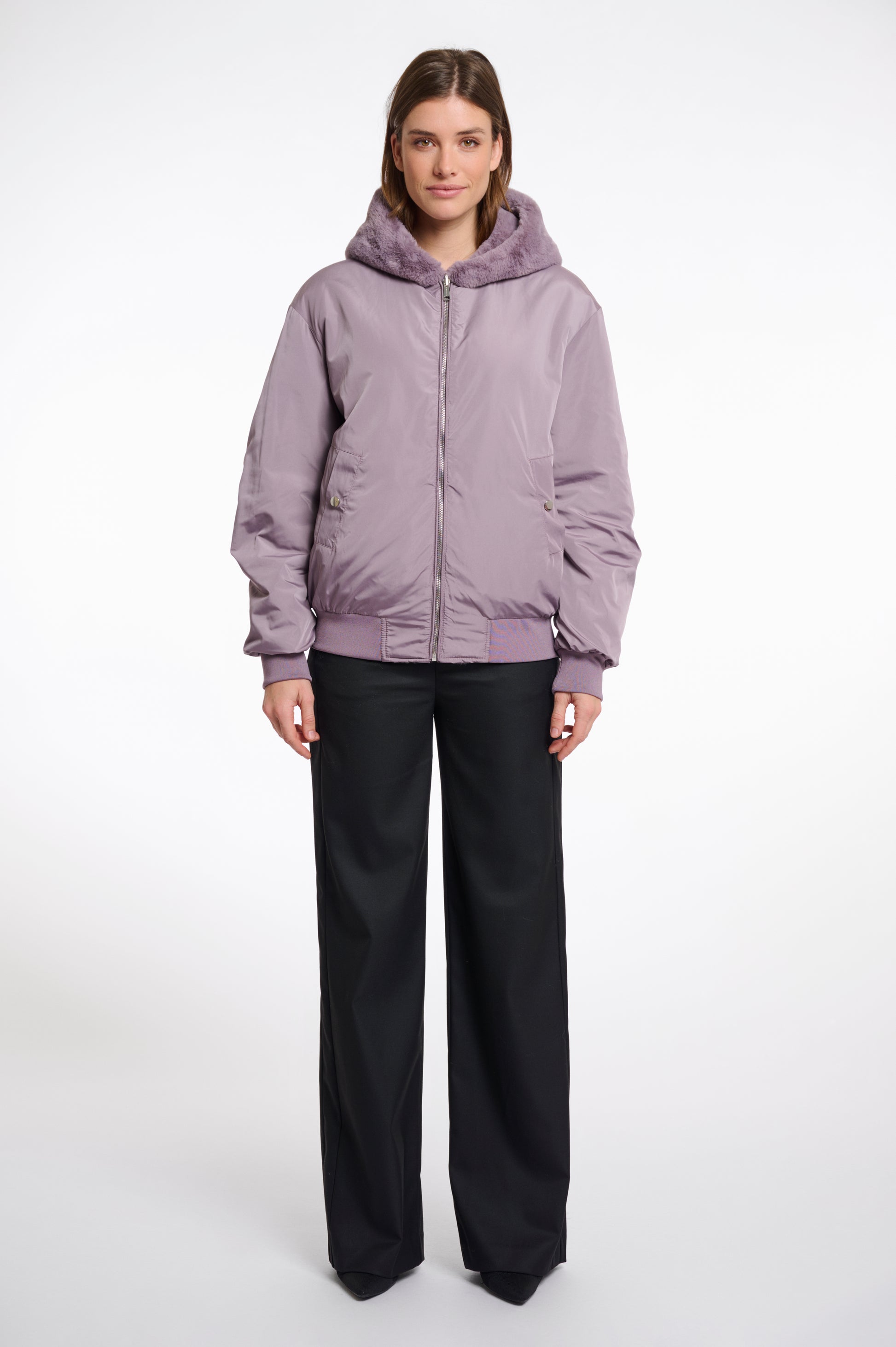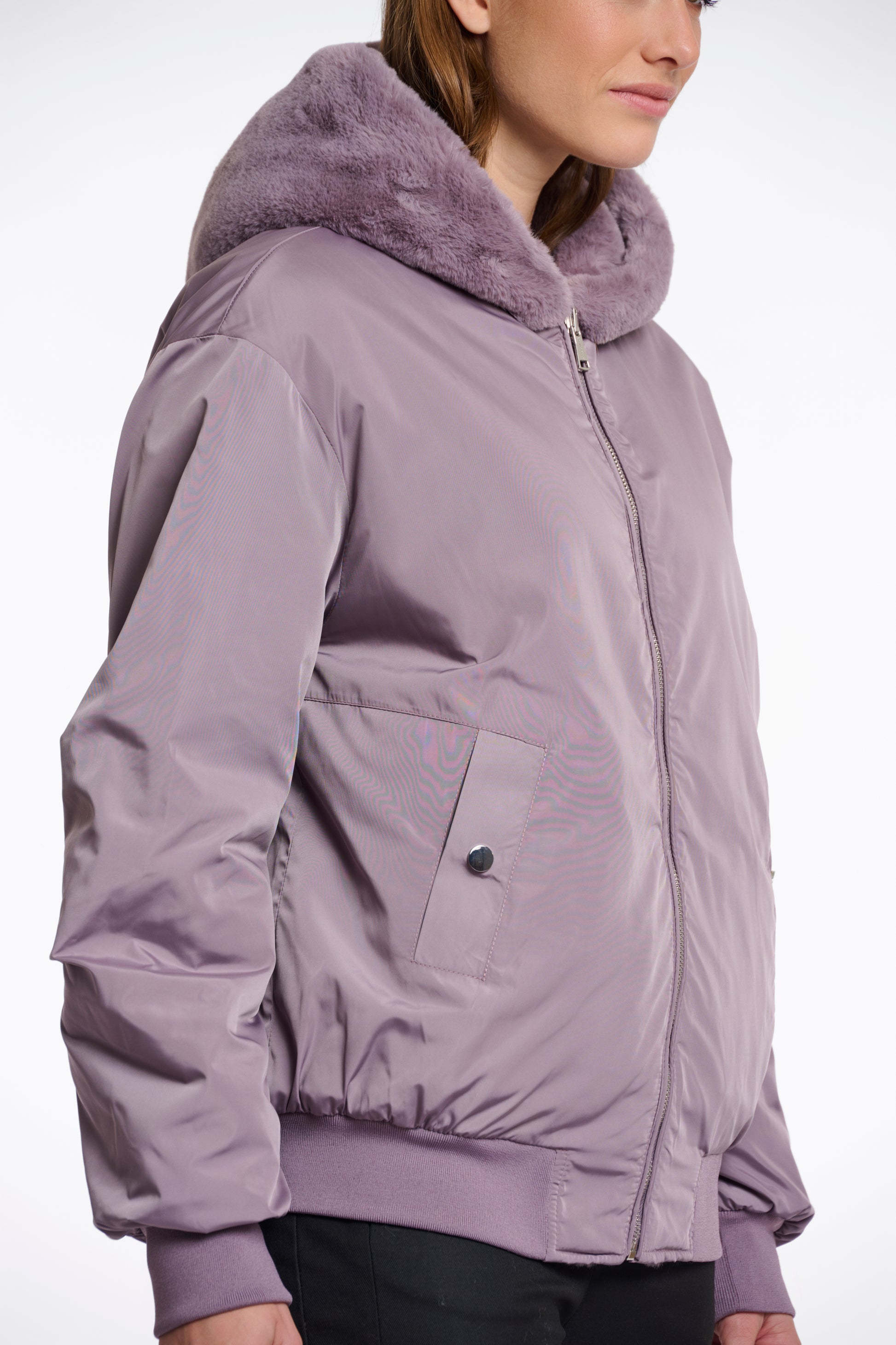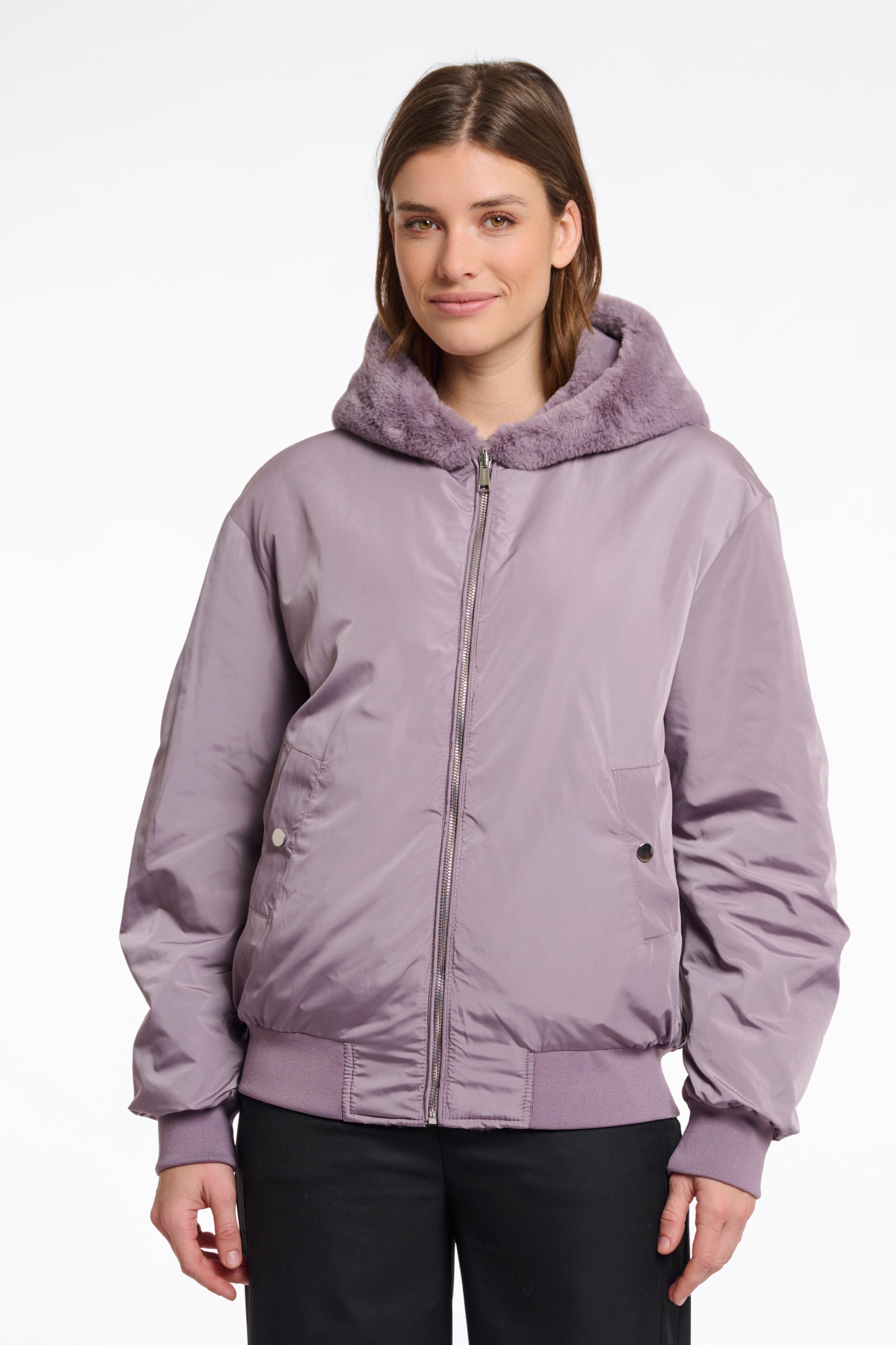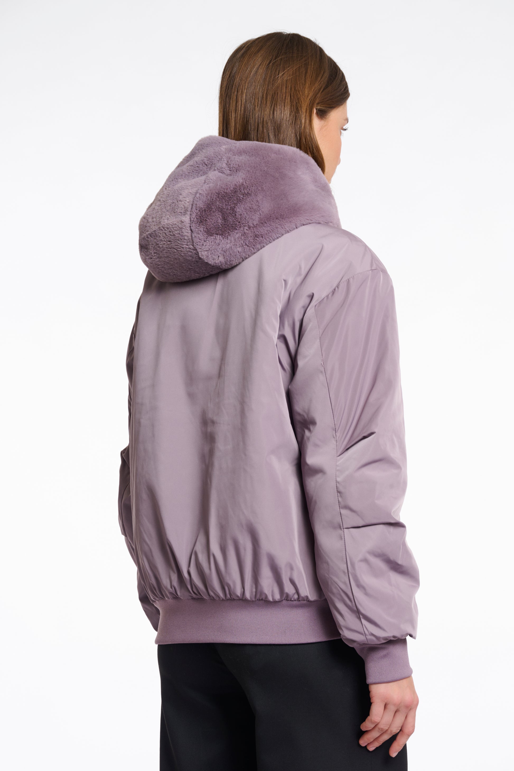 Reversible bomber jacket with faux fur hood