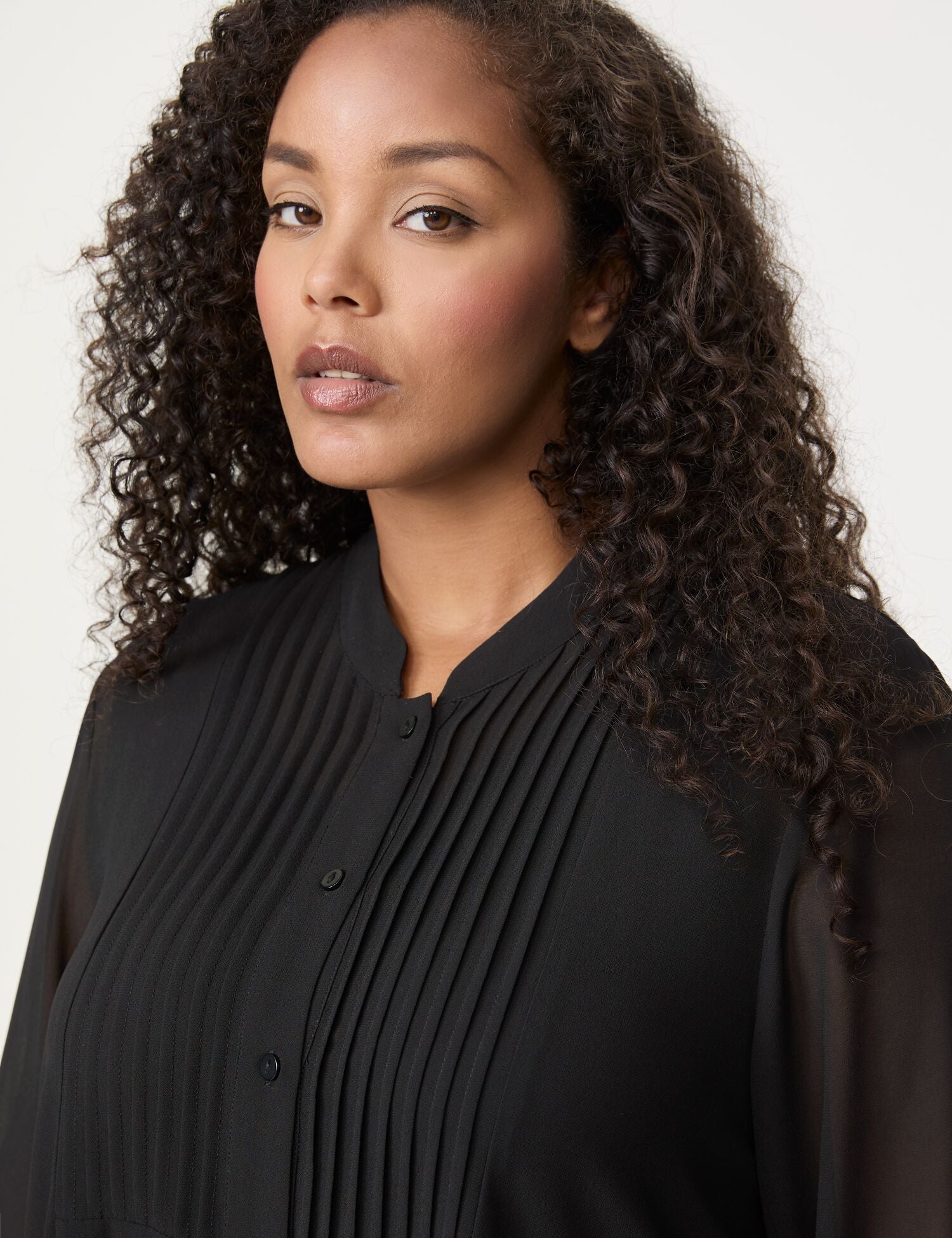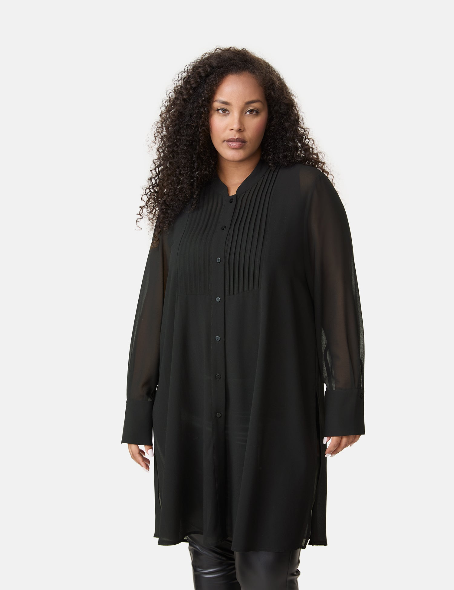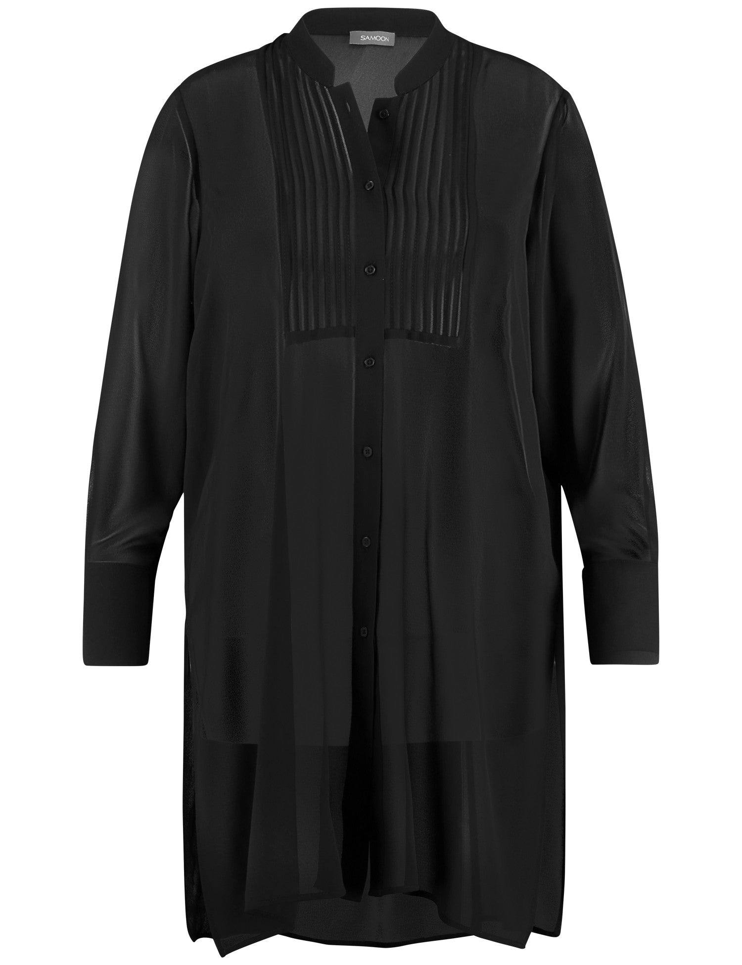 Lange Seitenschlitze. Kellerfalte im rücken. Bereit, mit einem echten Wow-Teil zu begeistern? Diese Bluse ist ein echtes Meisterwerk, das durch das aufwendig gearbeitete Biesenplastron eine besondere Eleganz erhält. Der zarte Crêpe verleiht dir eine unwiderstehliche Leichtigkeit und sorgt für einen Hauch von Raffinesse. Trage sie zu Lederleggings für einen edgy Style oder kombiniere sie mit eleganten Hosen für einen klassischen Look.