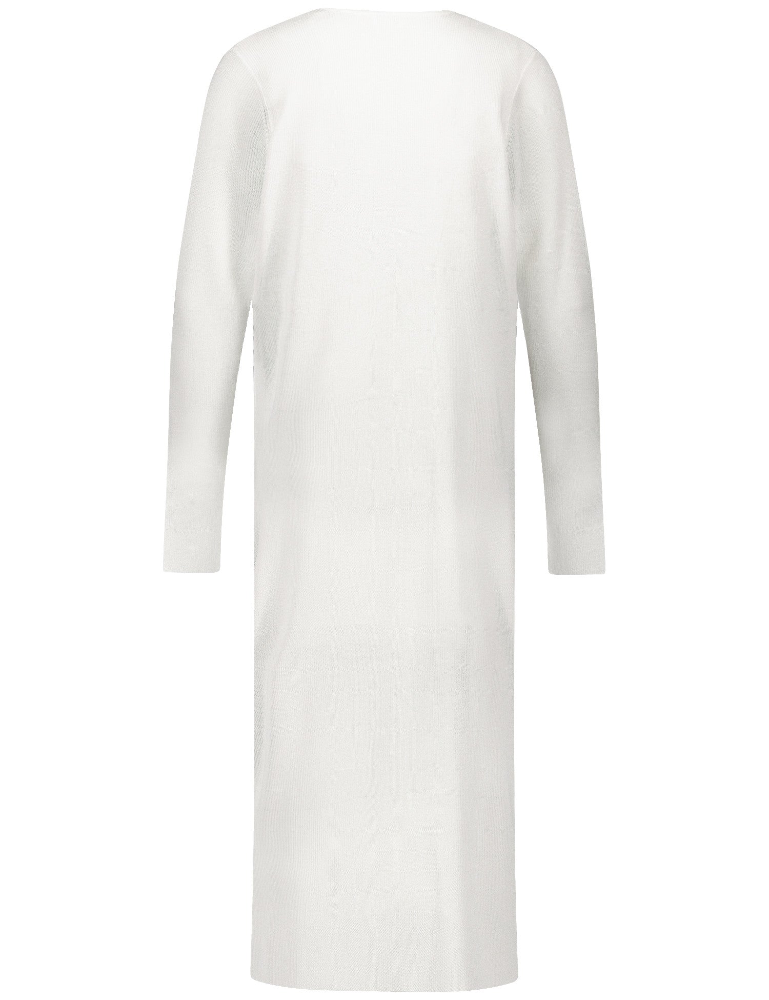 Semitransparenter Rippstrick. Lange Seitenschlitze. Dieser semitransparente Longcardigan aus softem Rippstrick verleiht jedem Look eine elegante Leichtigkeit. Die langen Seitenschlitze und geschlitzten Ärmel sorgen für eine fließende Silhouette und besondere Raffinesse. Ob über einem Top für lässige Eleganz oder als Layering-Piece an kühleren Tagen – dieser Cardigan ist ein vielseitiges Must-have für stilbewusste Outfits.