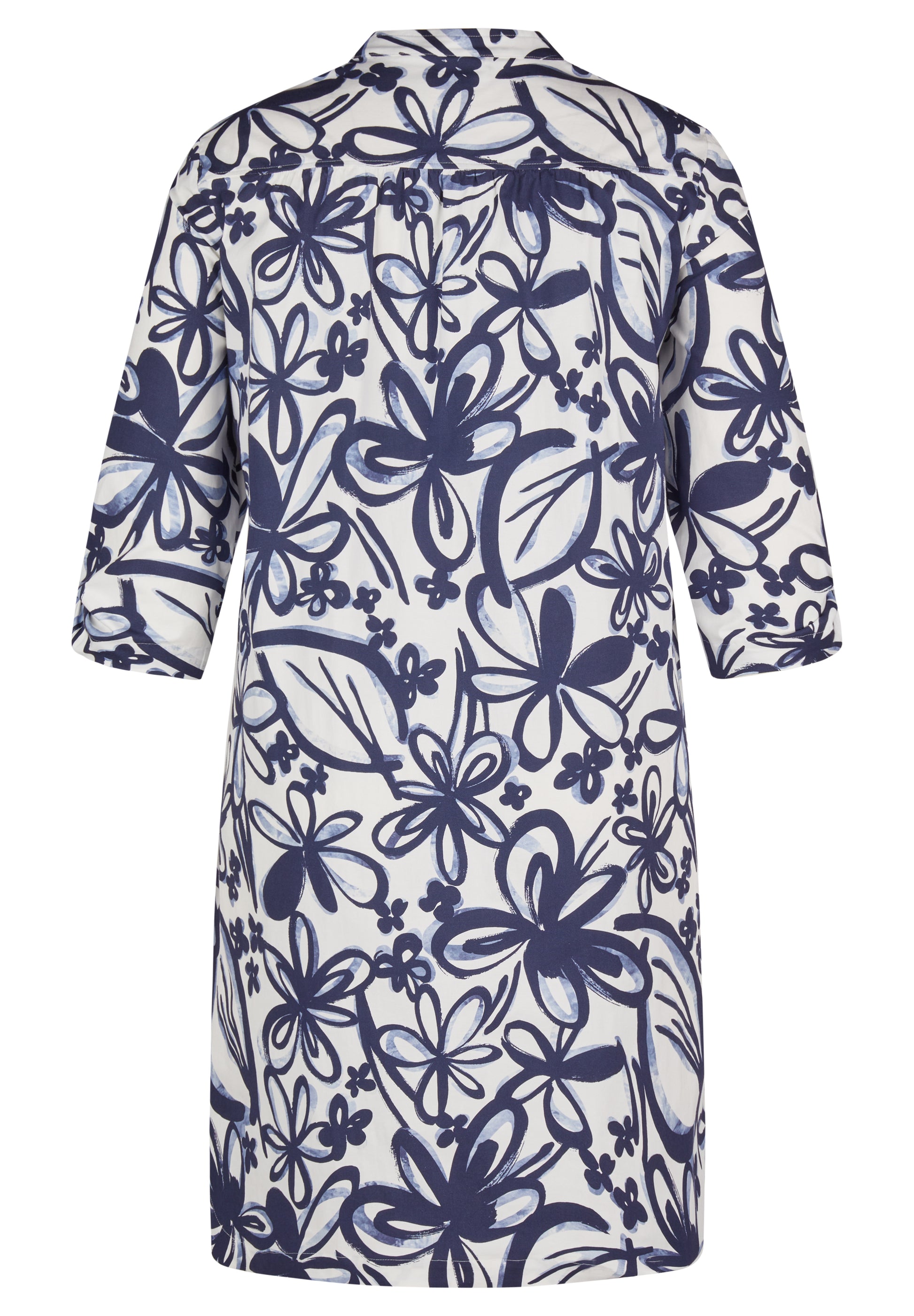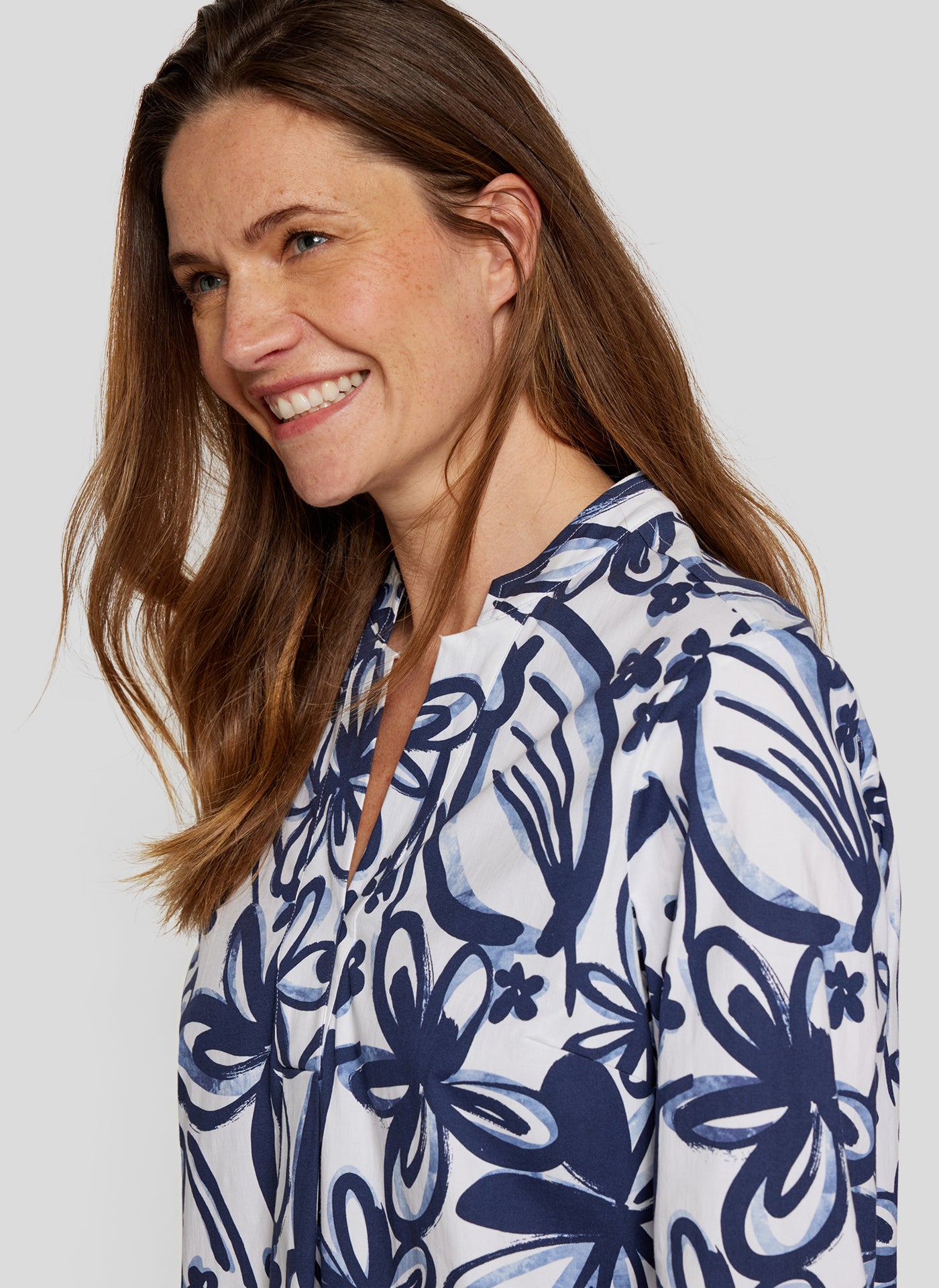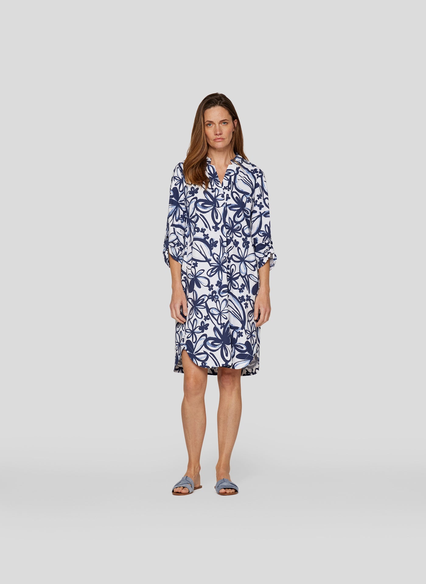 Dieses Blusenkleid begeistert mit einem ausdrucksstarken floralen Allover-Print und einem lässigen, luftigen Schnitt. Der feminine V-Ausschnitt und die 3/4-Ärmel mit praktischem Riegel zum Hochkrempeln verleihen dem Kleid eine entspannte Ausstrahlung. Ideal für warme Tage, ob im Alltag oder im Urlaub.Leichtes, fließendes Material.V-Ausschnitt für eine feminine Note.3/4-Ärmel mit Krempelfunktion und Knopf.Lebendiger floraler Allover-Print.Bequemer, locker fallender Schnitt.