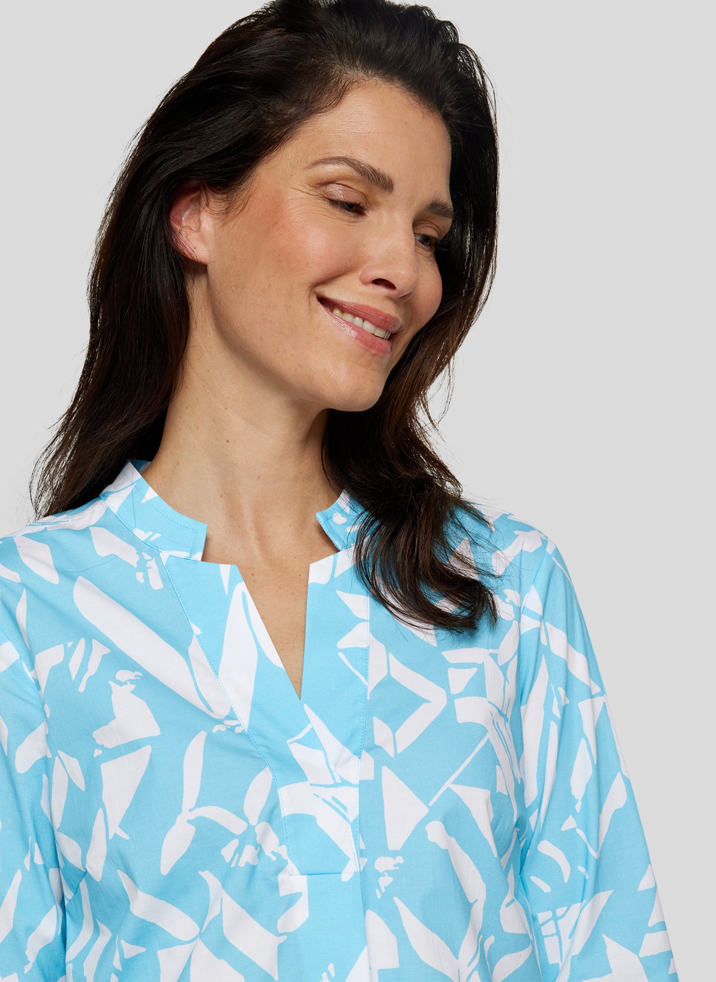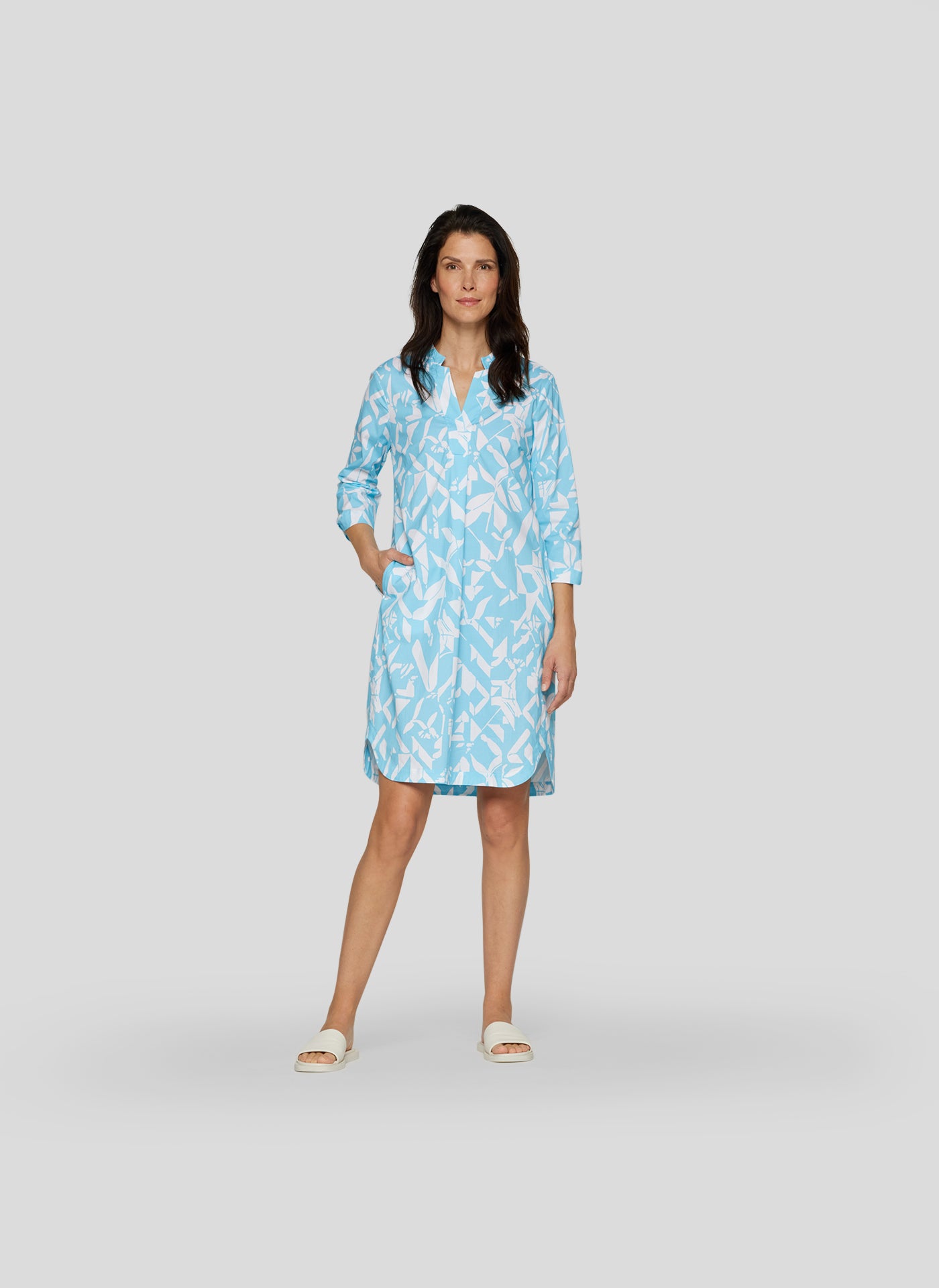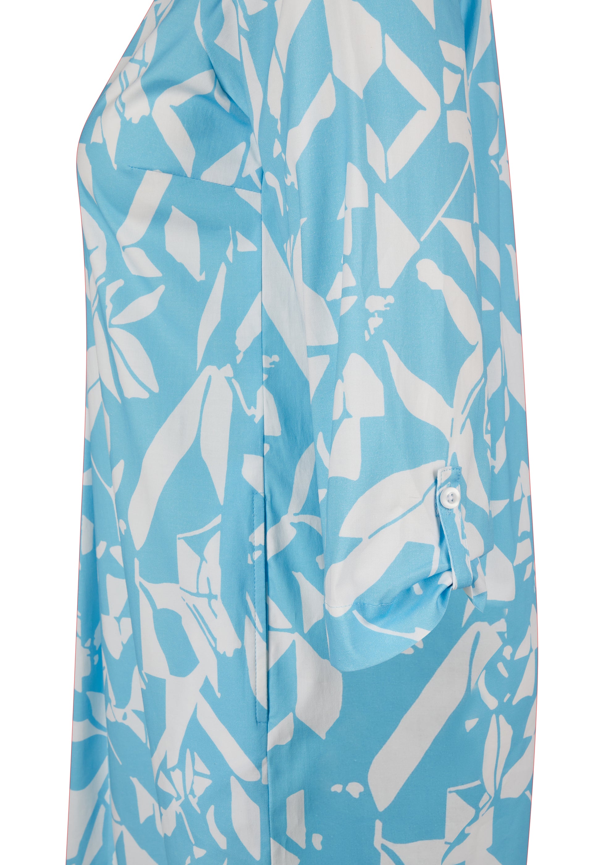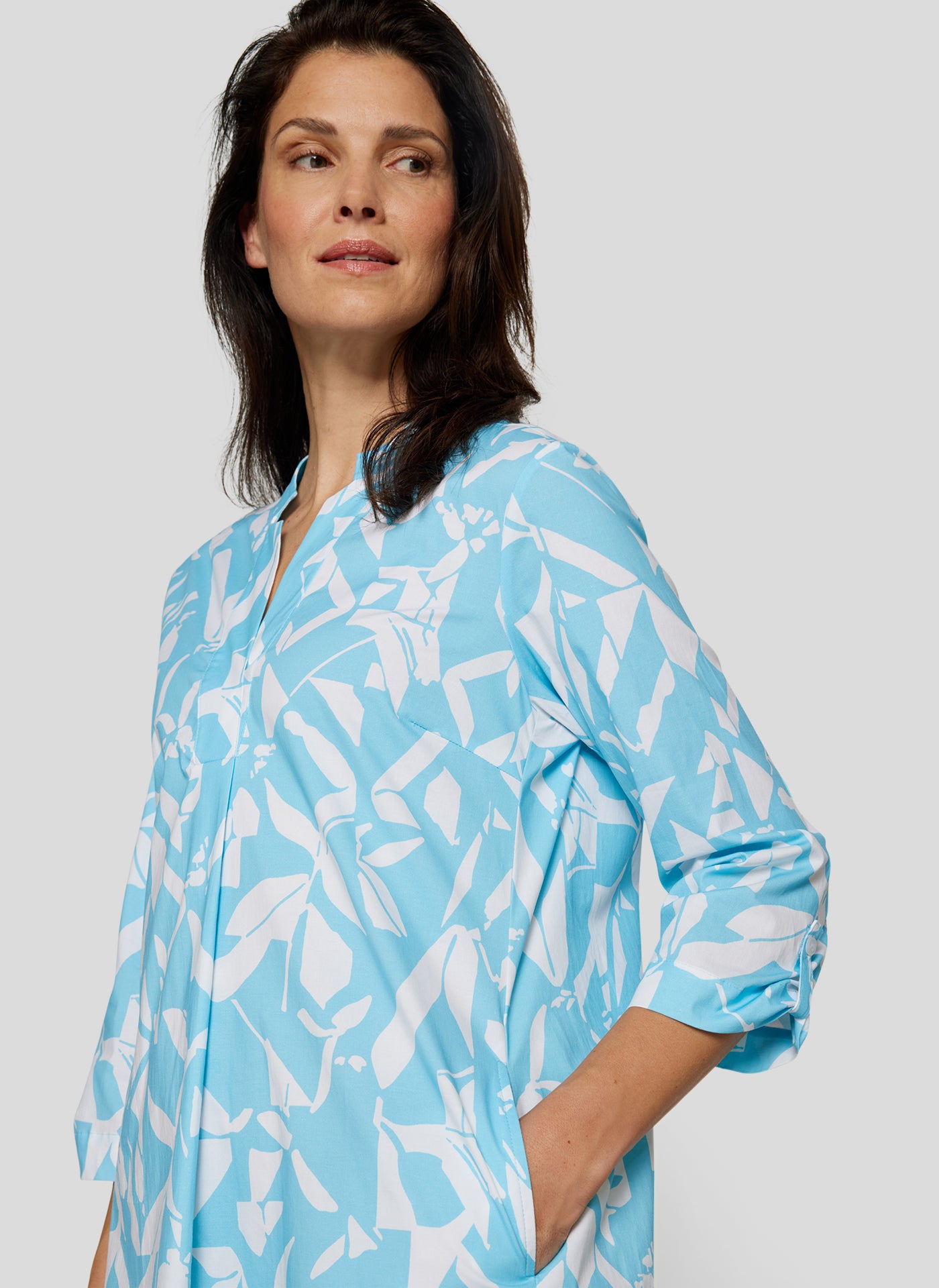 Dieses Blusenkleid begeistert mit einem frischen, grafischen Allover-Print und leichtem Tragekomfort. Der schmeichelhafte V-Ausschnitt und die 3/4-Ärmel sorgen für eine feminine Silhouette, während der lässige Schnitt Bewegungsfreiheit garantiert. Ideal für Urlaub, Freizeit und warme Tage.Fließendes, leichtes Material.Moderner V-Ausschnitt.3/4-Ärmel mit Schlitzdetail.Lockerer, komfortabler Schnitt.Abgerundeter Saum für einen lässigen Look.