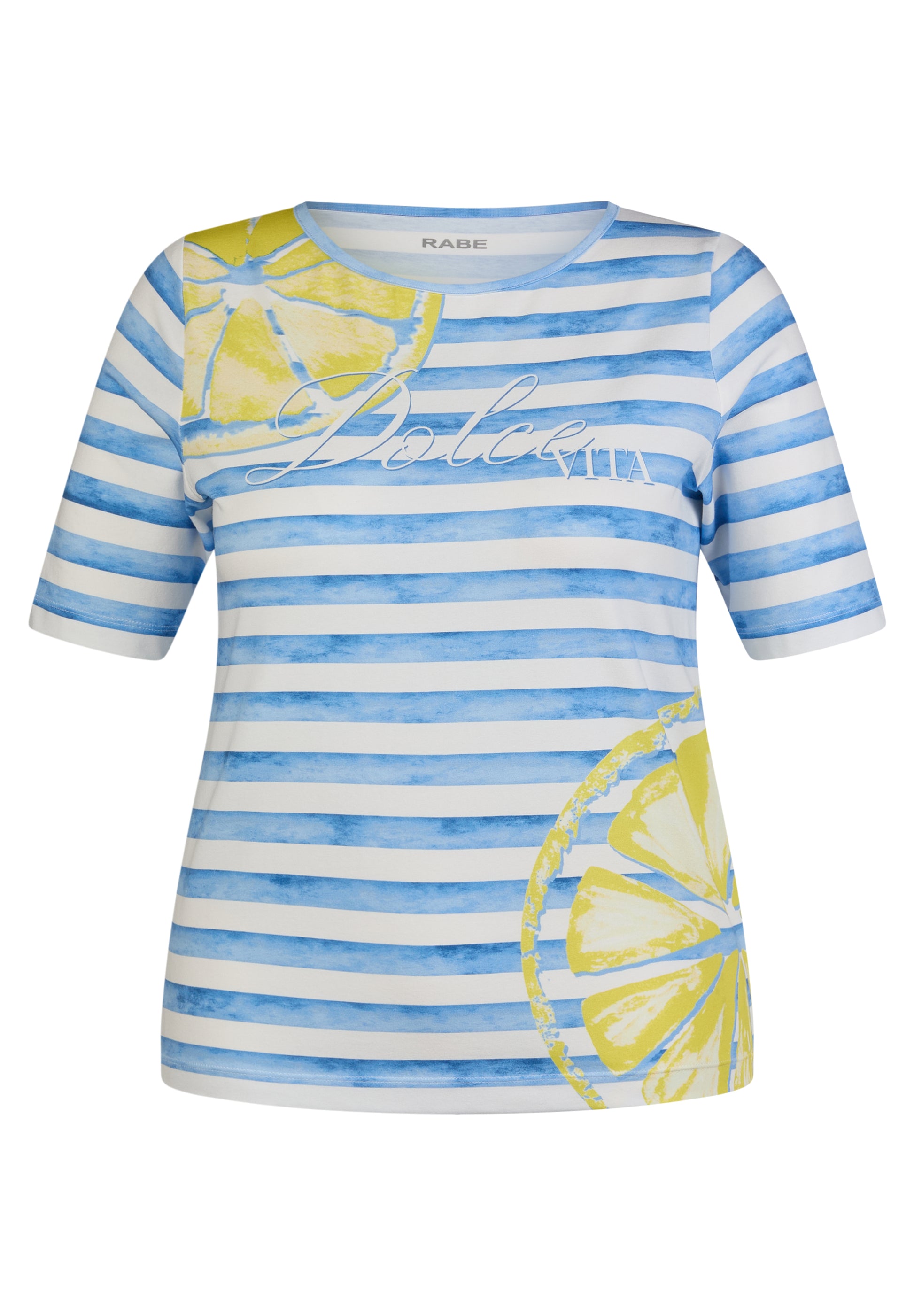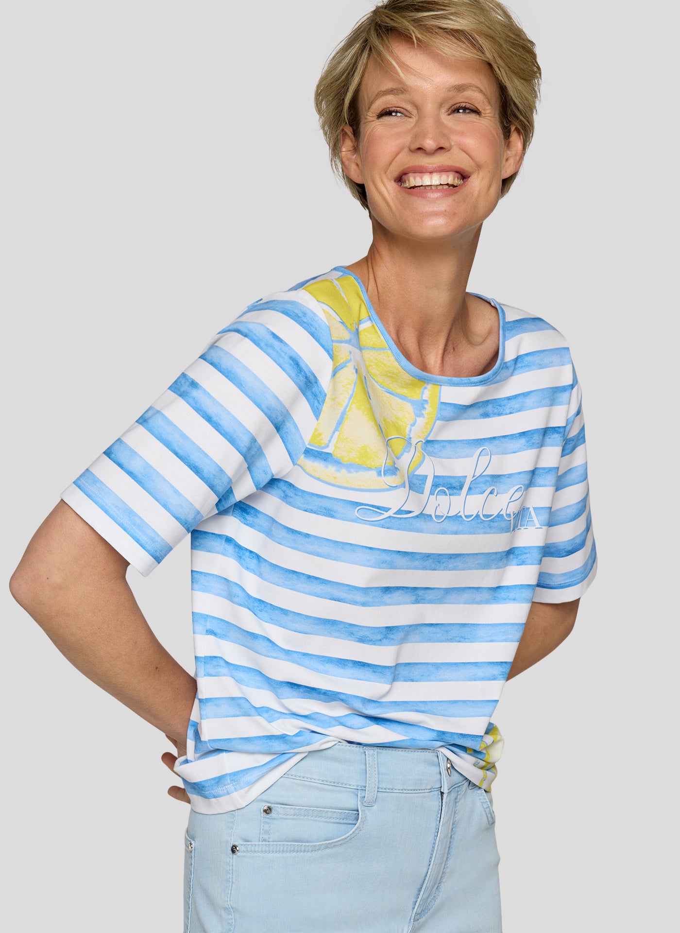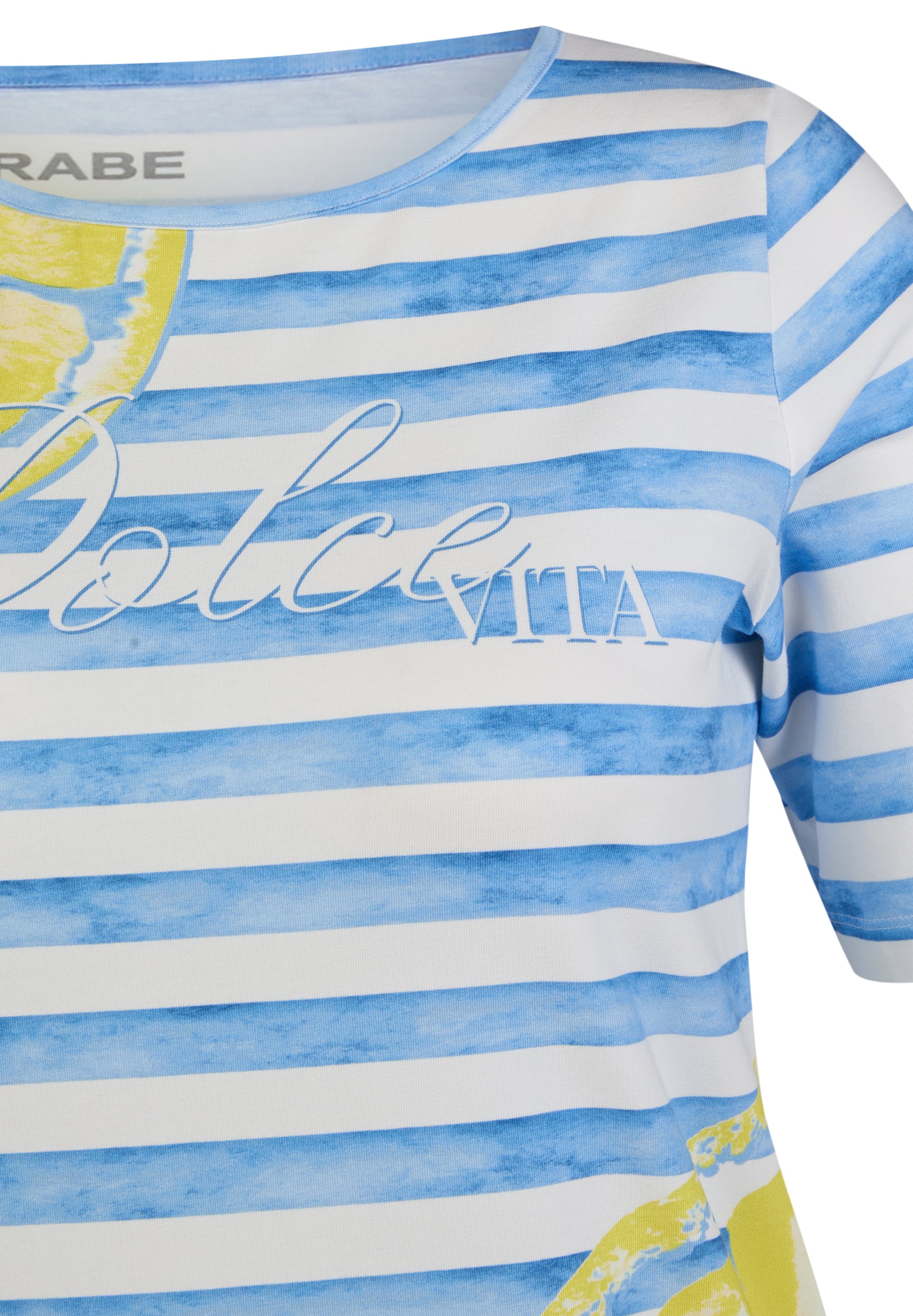 Dieses Shirt bringt italienisches Lebensgefühl in Ihre Garderobe. Der klassische Streifenlook wird durch das fruchtige Zitronenmotiv und den verspielten Schriftzug _Dolce Vita_ aufgelockert _ ideal für sonnige Tage und Urlaubslaune.Zeitloses Streifenmuster in moderner Farbgebung.Plakativer Zitronenprint als sommerliches Highlight.Verschnörkelter _Dolce Vita_-Schriftzug mit femininer Ausstrahlung.Rundhalsausschnitt und halblange Ärmel für angenehmen Komfort.Leicht taillierte Passform _ perfekt für legere Sommerlooks.
