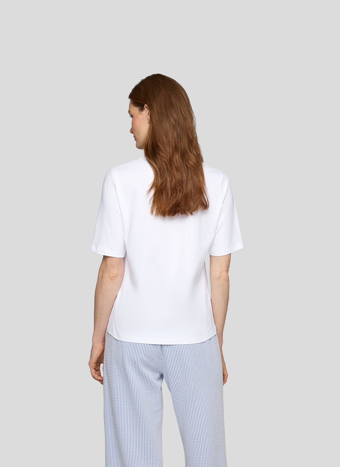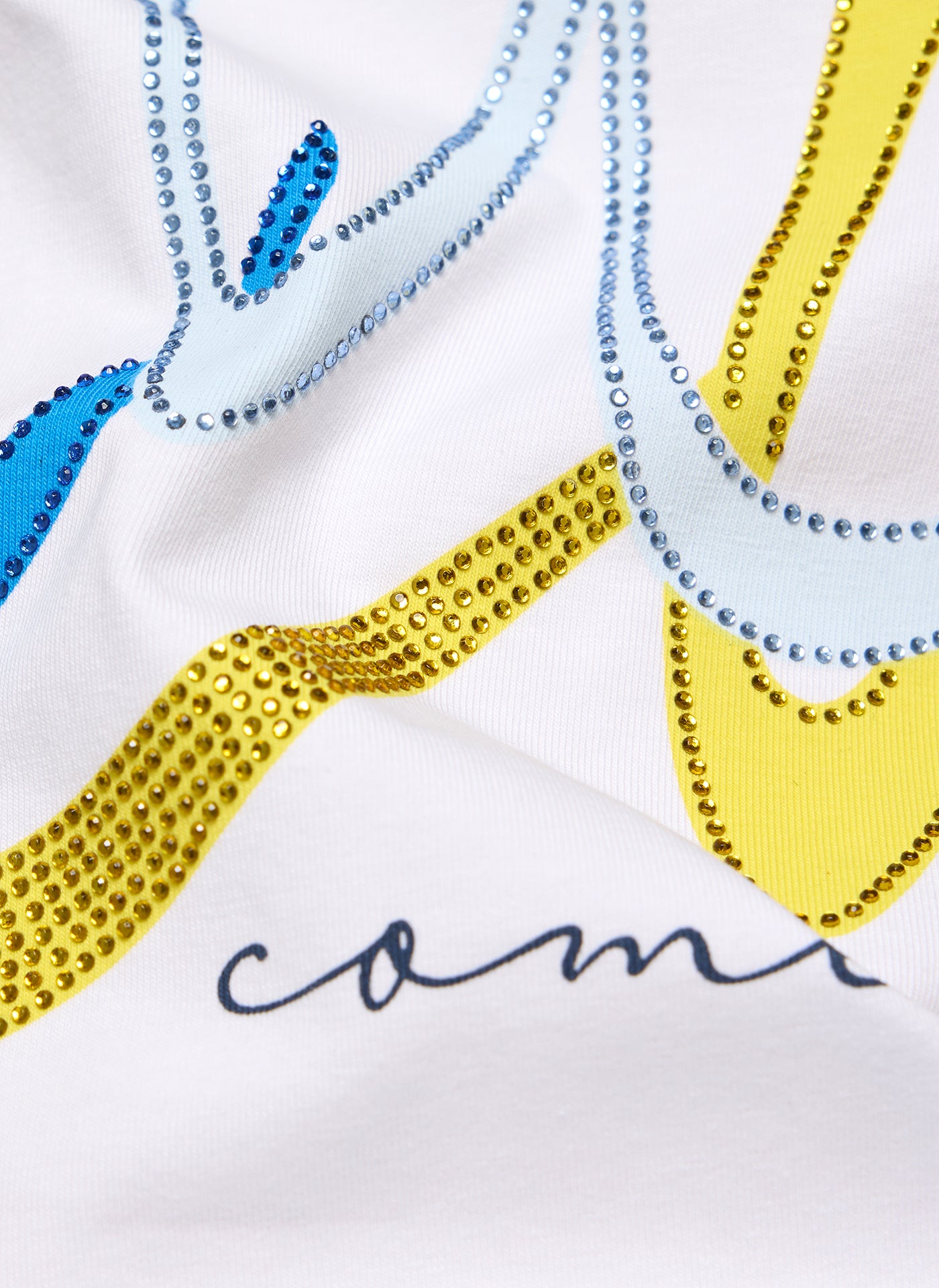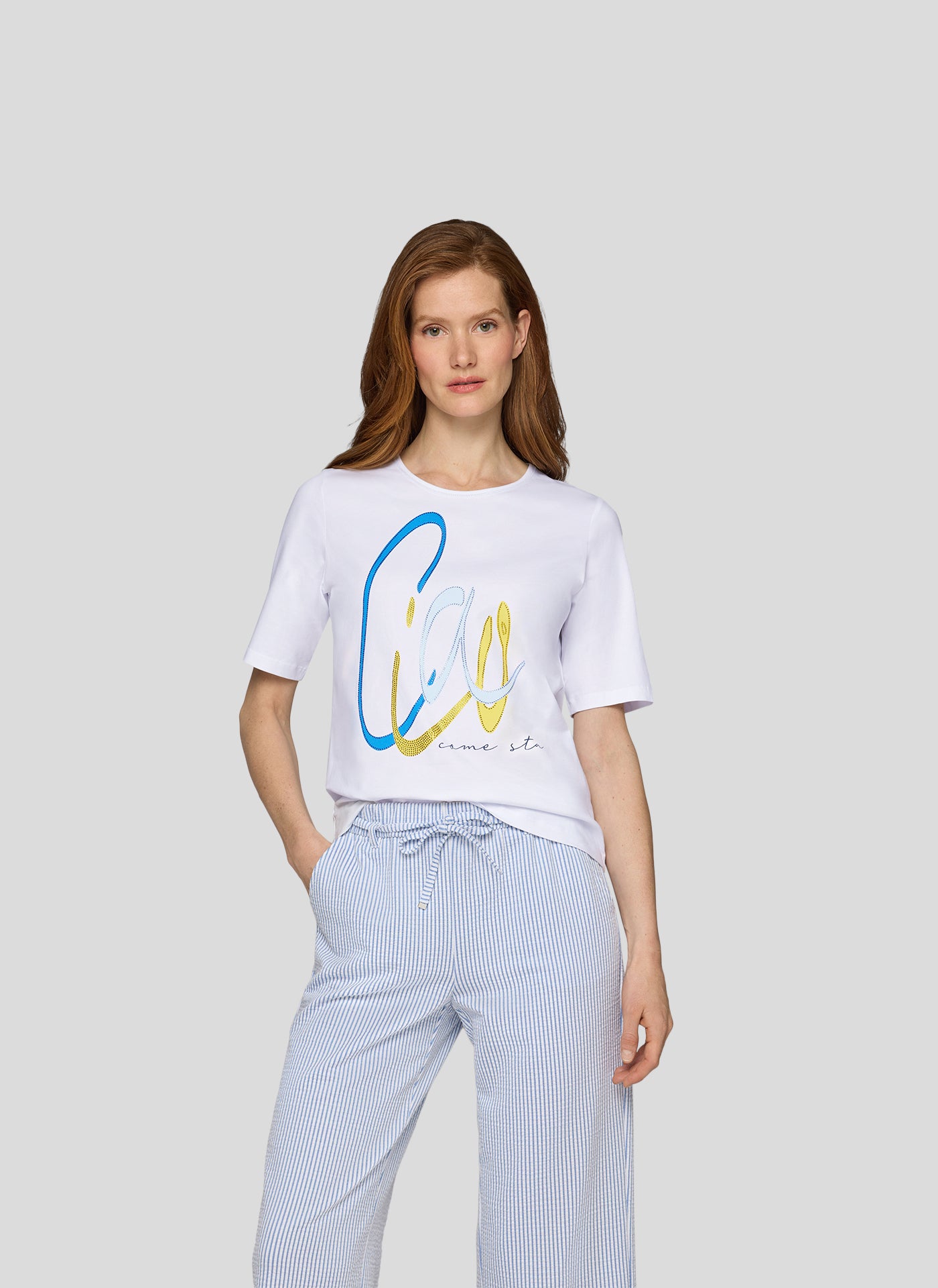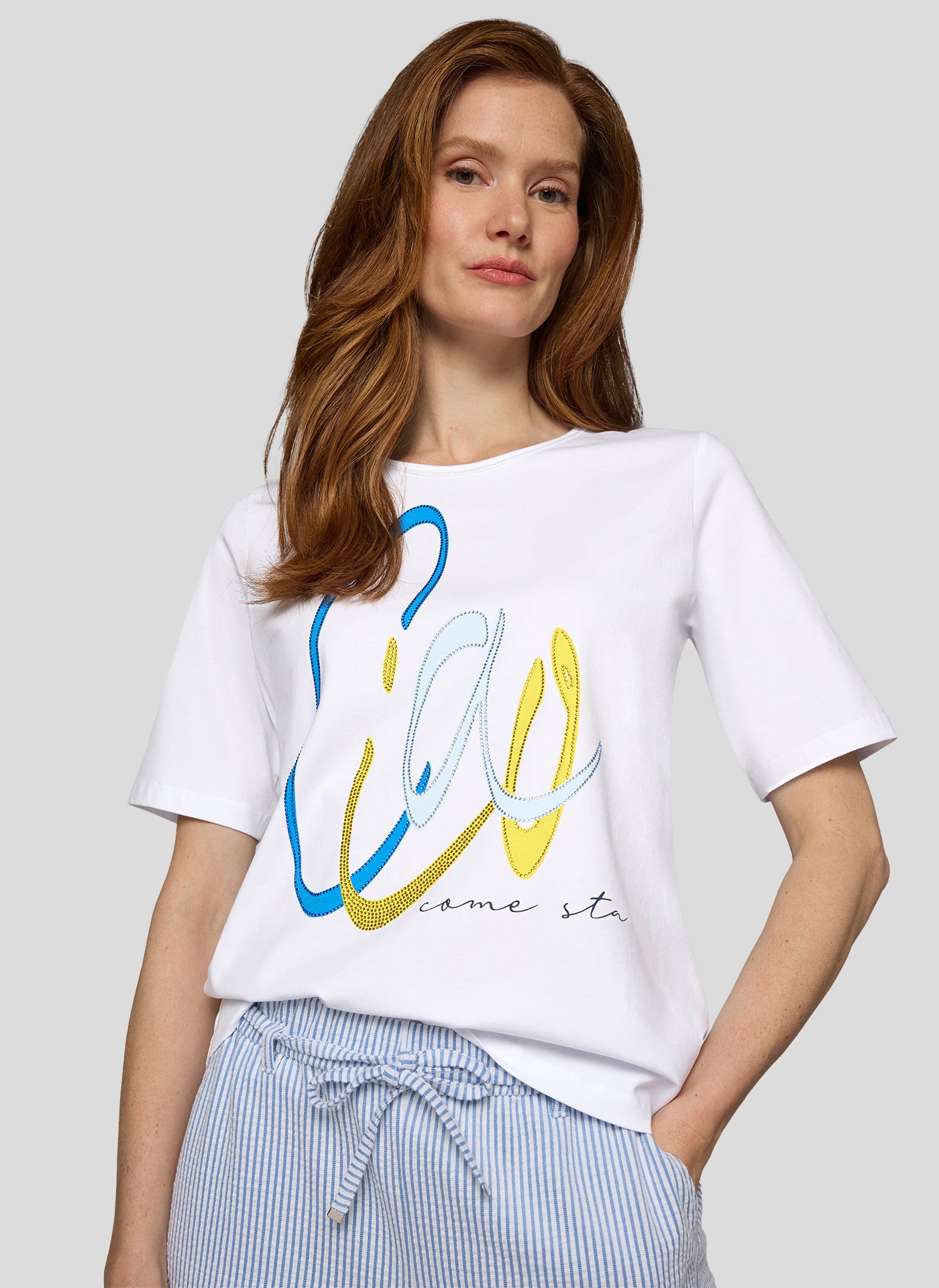 Dieses Shirt kombiniert einen klaren Look mit auffälligen Details: Der geschwungene Schriftzug in frischen Farben wird durch glitzernde Strasssteinchen effektvoll betont. Die bequeme Passform und das elastische Material sorgen für angenehmen Tragekomfort.Dekorativer Frontprint mit Schriftzug und Glitzersteinen.Rundhalsausschnitt für einen klassischen Look.Halblange Ärmel _ ideal für Übergangszeit und Sommer.Elastische Jerseyqualität für hohen Tragekomfort.Perfekt kombinierbar zu Jeans, Röcken oder 3/4-Hosen.