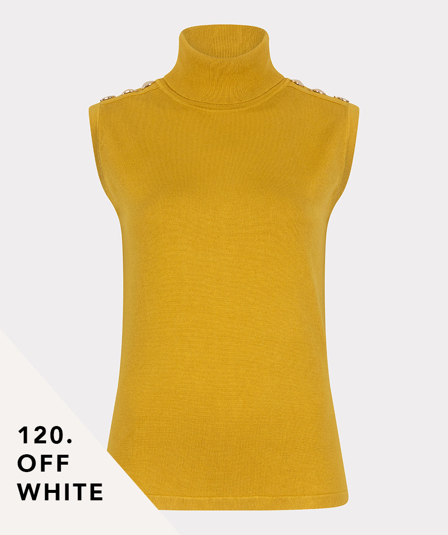 Ärmelloses Feinstrick-Top mit Rollkragen und coolen Bio-Knöpfen. Dieses Oberteil sieht toll unter einem gleichfarbigen Blazer aus. Das Oberteil ist aus 78% Viskose und 22% Nylon gefertigt. Das Model ist 1,73 m groß und trägt Größe S.